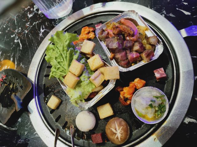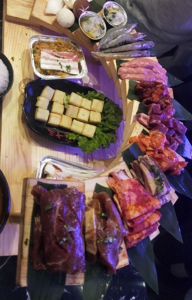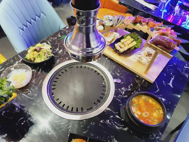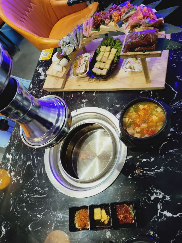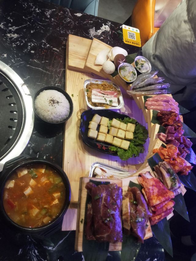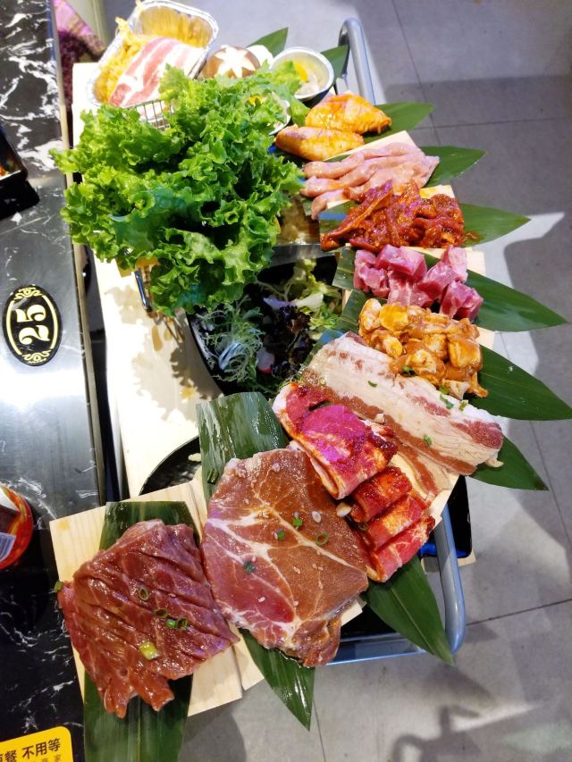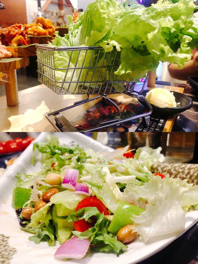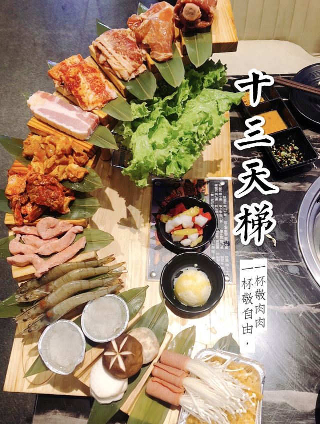 我们先选了团购的套餐,又额外单点了几道菜,四人吃足够了。 【十三天梯】颜值比较高的一道主推菜品,基本上每桌都有,里面有13道小份菜品,荤素搭配,第一次去吃图个新鲜,如果第二次去吃,我可能会选择里面喜欢的菜品单点 【蔬菜沙拉】在等炉子升温的过程中,吃点沙拉解闷儿还是不错的 【包肉生菜】因人而异吧,我不太喜欢这种韩式的吃法,更喜欢直接将烤好的肉蘸着佐料食用 【菠萝片】很小一份,中规中矩 【土豆泥】很小一份,中规中矩 【地瓜片】切片很薄,很容易就能烤熟 【自助小料】是不限量的,会提前给上好,如果自己不够吃的话,可以去小料台自己去添加