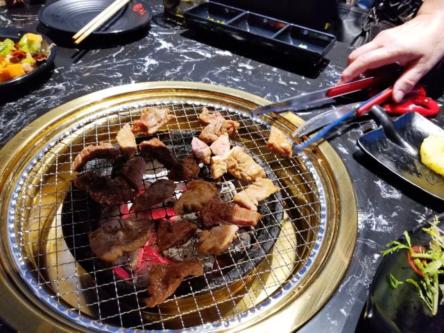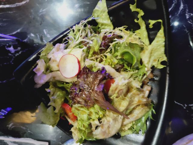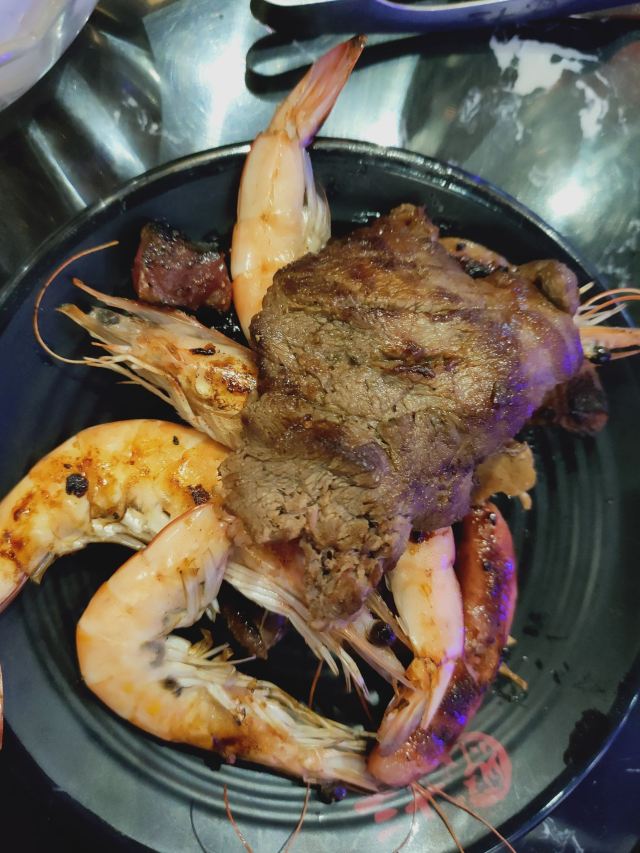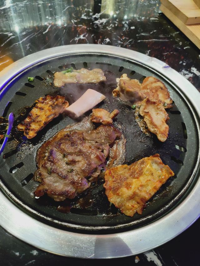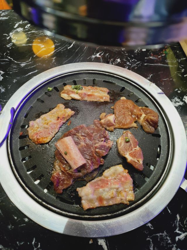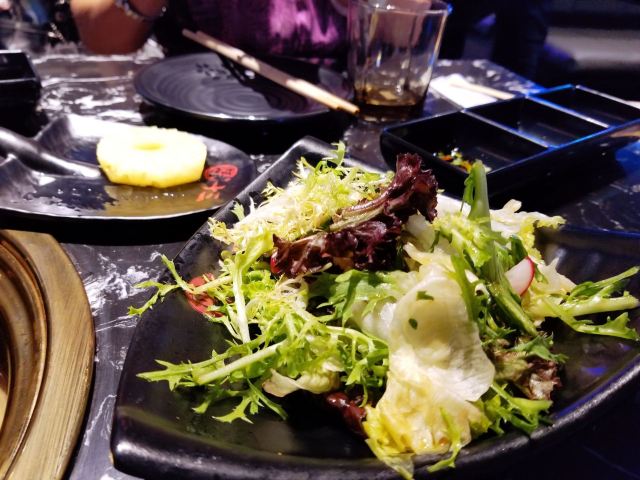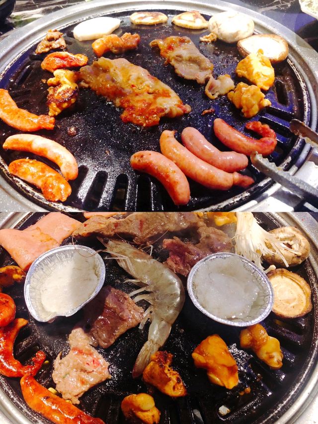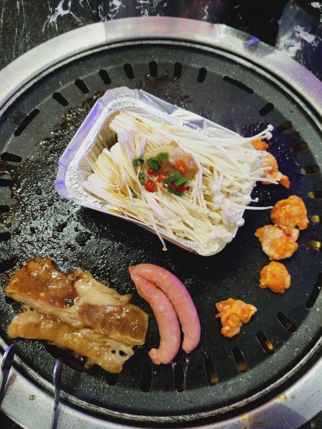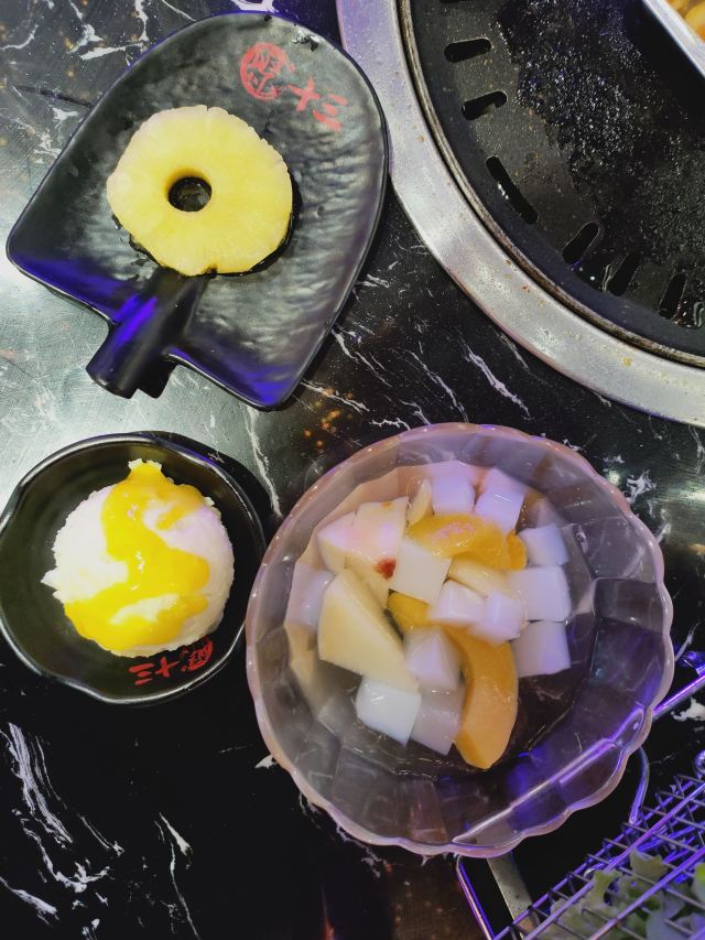 我们先选了团购的套餐,又额外单点了几道菜,四人吃足够了。 【十三天梯】颜值比较高的一道主推菜品,基本上每桌都有,里面有13道小份菜品,荤素搭配,第一次去吃图个新鲜,如果第二次去吃,我可能会选择里面喜欢的菜品单点 【蔬菜沙拉】在等炉子升温的过程中,吃点沙拉解闷儿还是不错的 【包肉生菜】因人而异吧,我不太喜欢这种韩式的吃法,更喜欢直接将烤好的肉蘸着佐料食用 【菠萝片】很小一份,中规中矩 【土豆泥】很小一份,中规中矩 【地瓜片】切片很薄,很容易就能烤熟 【自助小料】是不限量的,会提前给上好,如果自己不够吃的话,可以去小料台自己去添加