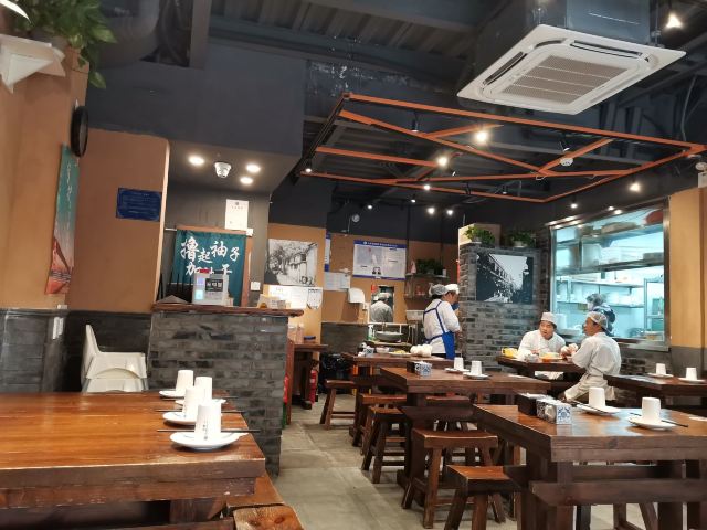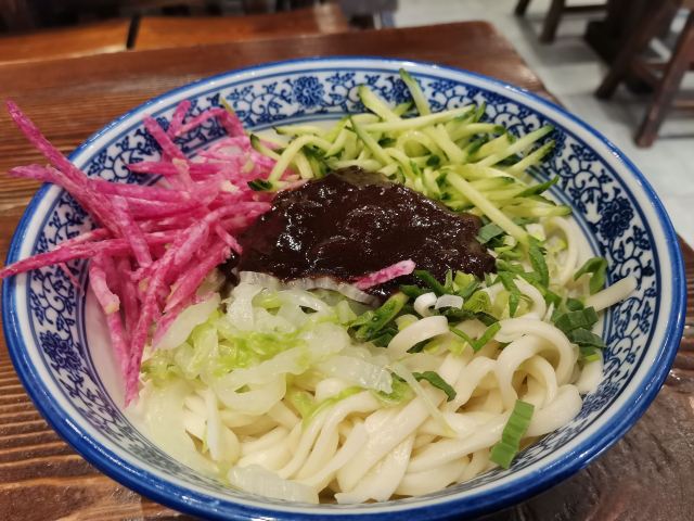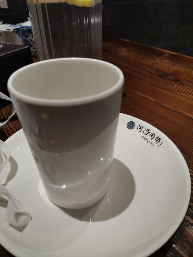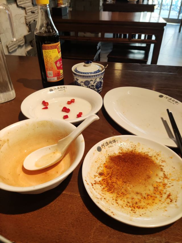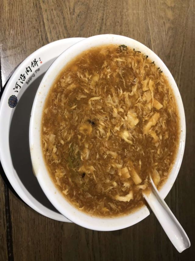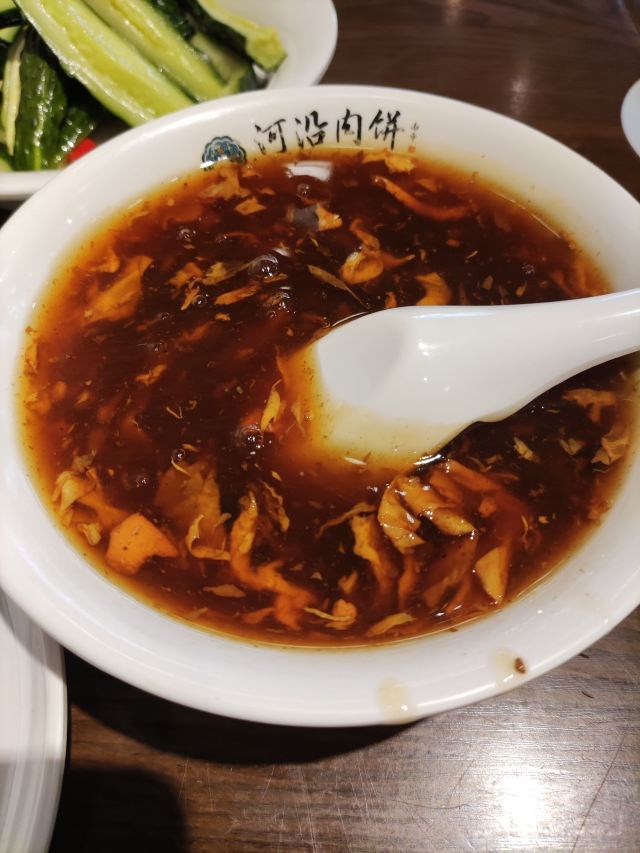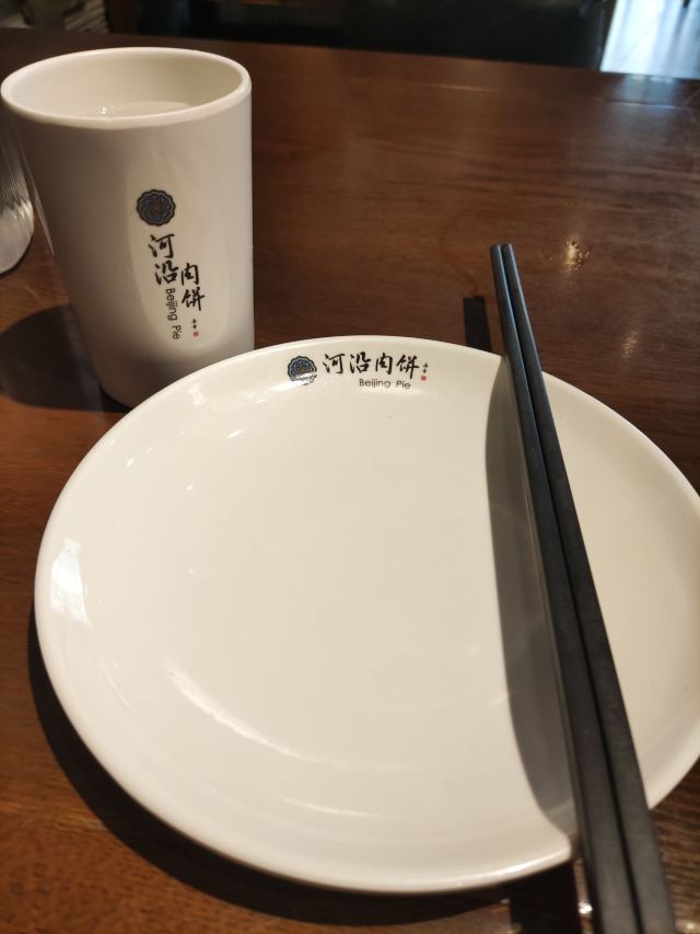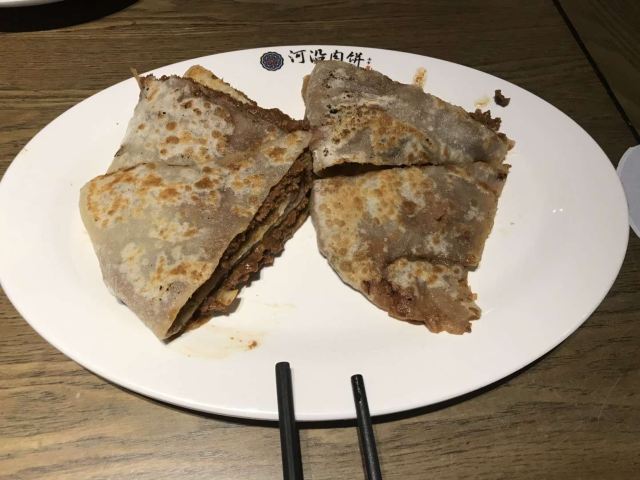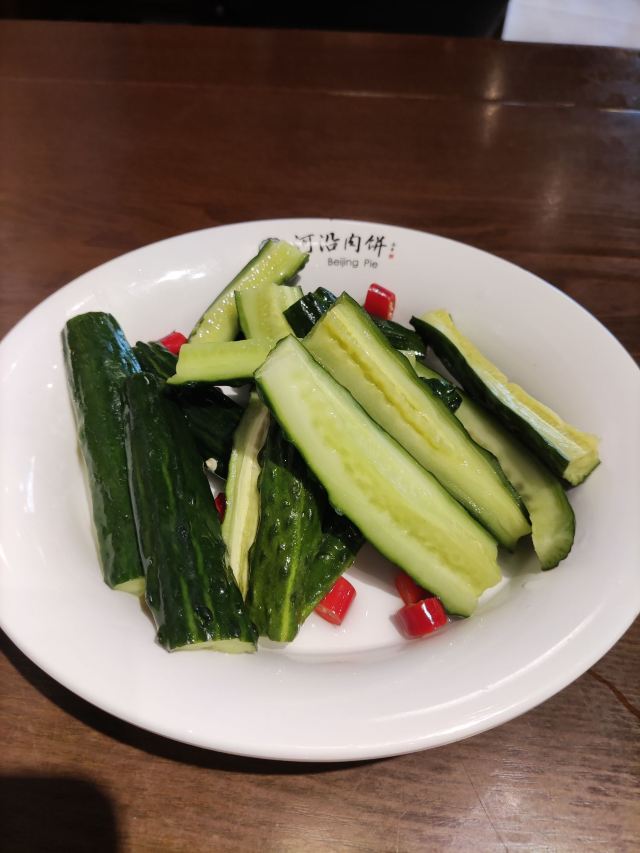受到热捧的河沿肉饼—— 今天逛完国博,步行走到煤市街,已过了饭点儿但还没吃午饭,正好路过河沿肉饼,想想总是从这儿路过,但还没进店吃过呢,于是进来尝尝。最近这河沿肉饼可是被很多人热捧为“北京第一好吃的肉饼”,其实用不着捧,单凭这家店的位置就已经不用担心生意不好做了,这可是客流最大的路段呀,根本用不着过多宣传吧。就比如现在,都已经三点了,但店里几乎满座儿,虽然不至于排队,但客流足可以说是“络绎不绝”了。原来一直没来的主要原因,是觉得这种大景区周边的馆子,一方面太嘈杂,另一方面服务估计很难有多周到,可没想到今天进来了,居然发现服务是很热情的,服务员很有耐心,坐下了先上一壶热水,就这一点很多饭馆都做不到,而且上菜是很快的,几乎没怎么等。 今天点的是肉饼、酸辣瓜条、酸辣汤,主食、小菜、汤都有,而且都是最平常也最经典的。肉饼一份量不算小,一个人绝对够吃,肉馅儿也比较足,味道不错,倒也谈不上有多惊艳,反正要说是“第一好吃”无法置评,毕竟我也不敢说在北京吃过多少家肉饼,也不知道这“第一好吃”的标准应该是什么样,总之就是不错吧,能排第几说不清楚。酸辣瓜条一份不少,味道清新,个人口味原因,感觉稍稍欠一点点甜。酸辣汤也不错,味道适中,豆腐条略少了一些。这一套下来,居然吃得有些撑,感觉是十分不错的一次体验,这河沿肉饼果然不错,今天来对了。 就提一个小意见吧,把北墙修修吧,掉了不少墙砖,挺不错的环境,看着有些碍眼。