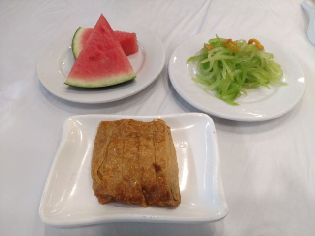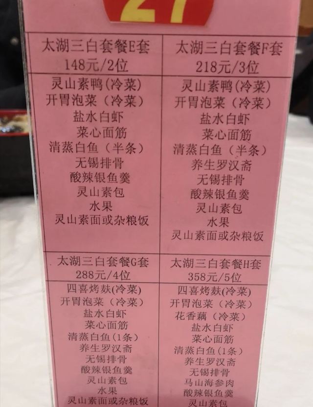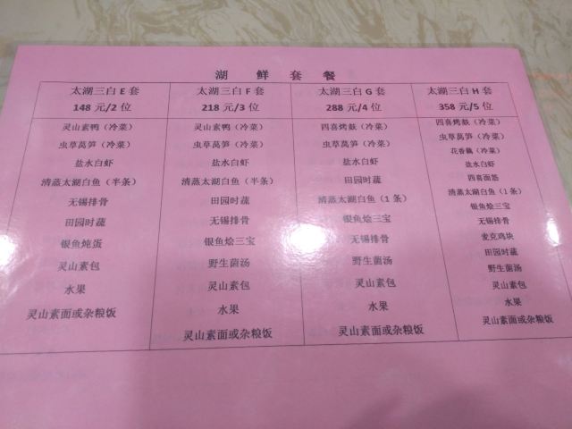 灵山大佛景区真的太商业化了点,吃饭的地方不少,本想吃素食,后来看到套餐不错,就进来了。 选了太湖三白E套餐148元,先到收银台付款,拿着小票找了个靠窗的位置,就餐的人多服务员太少,满场追着找,不过给了小票后立即来换了桌布,送上餐具。 双人套餐量不少,两个人都没吃完,胃口小的三个人完全能吃,素面真的不好吃,寡淡无味,白虾有几只死了,蘸醋会比较好,半条白鱼不错,也是蘸醋更好,银鱼炖蛋也偏淡,无锡排骨甜甜的很合本人口味,素菜包的馅很好吃,本人只吃馅没吃皮,在景区这样的套餐还是挺不错的。