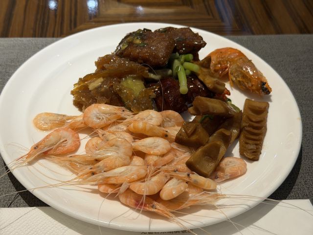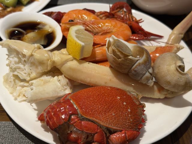 YoYo_3D0F9B1A服务很不错,收盘收的非常勤快,菜色看的业非常好看,但是味道真的大失所望,首先是味精放的太多,调味太少,不觉得多好吃回去还狂喝水。雷点在于盐水虾!对,就是那个盐水煮白米虾,那个虾竟然一点味道都没有,吃出了腥味和虾肉不新鲜的松散肉质,这可是一道食堂菜啊(酒店自助餐基本都是食堂菜色,而难吃程度更甚食堂,毕竟食堂的水煮虾不会煮出一种反复煮虾的感觉)这种情况延续到了提供的所有水产,请注意,是所有,包括鲳鱼黄鱼三文鱼螃蟹,所有水产的肉质都是那种冷冻了好久好久的感觉,不仅是不鲜,肉质松散,最离谱的是寡淡无味,真的非常失望😞甜品也都是一股子廉价的味道,感觉自己跟在食堂吃大锅菜一样,大锅菜还没有这么多味精