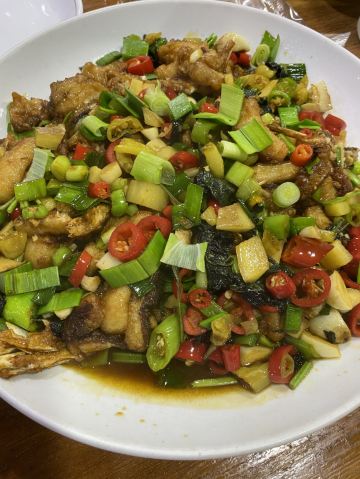 过口油辣鱼,西红柿炒蛋,蚕豆炒肉片,龙鱼炒雪菜,生炒鸡,时件香干,干锅土豆片,冬萝卜炒豆芽,雅片鱼尾,葱油虾,紫菜蛋花汤,干锅包心菜,雪菜笋,蒸肉末,红烧仔排,炒花蛤肉,干锅茶树菇,西红柿蛋汤,炒地衣,炒大头鱼,廿八都豆腐,酸辣汤,干锅千叶豆腐,红烧肉,茄子豆角,牛筋炒青椒,春卷,青豆炒肉片,剁椒鹅