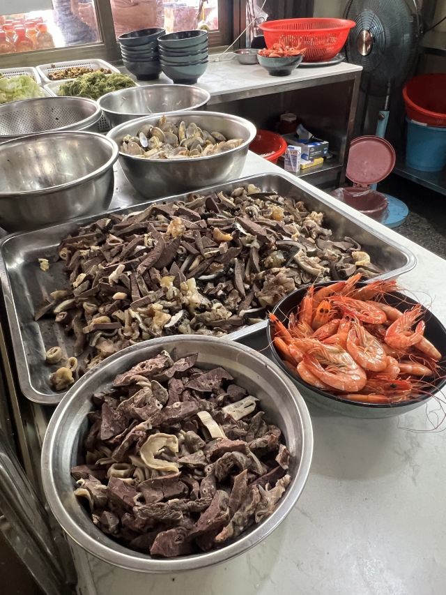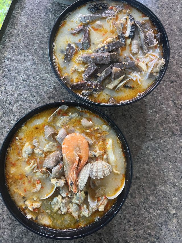 一直在路上的猫环境:特意从文昌回海口的路上绕来铺前镇,为了吃一碗正宗的糟粕醋,铺前镇上面全是卖糟粕醋的,选的这一家其实旁边有一家环境相对好一点,这家那种大排档式的环境,如果是夏天吃应该会有点热。 口味:其实本地人吃糟粕醋应该是过桥的吃法,就是单独的料,然后给你打一碗糟粕醋的汤,把它沾着来吃,可是这样也没有问我,就直接给我放在一起了,可能大部分游客都是这个待遇吧。 海鲜综合糟粕醋20元。海鲜的里面有一颗虾,有螺,钉螺和花蛤以及蛏子都是提早烫好放在那边的,吃起来新鲜度一般,还加了海草,海带和粉,主要是这些东西都是凉的,把这个汤浇进去,汤也是温的,我在其他地方吃过糟粕,醋是热的,热的就比较好吃。 全套综合糟粕醋20元。没这个全套综合的是猪和牛都有的,结果里面全部都是牛杂,就是牛肚那些有一点点腥味儿,然后加了一点点的花蛤和丁螺,比起海鲜的更不好吃一点,总体来说这家吃的很一般,不知道是不是因为没有吃到正宗的感觉,还没有在三亚吃的糟粕醋好吃。他家的斑斓糕4元一个反而蛮好吃的。