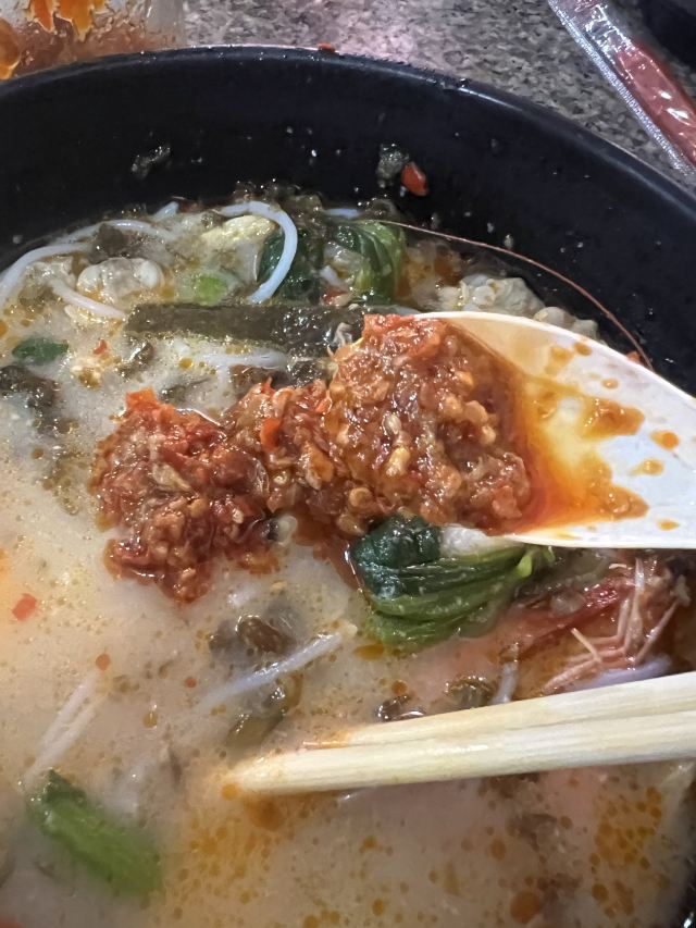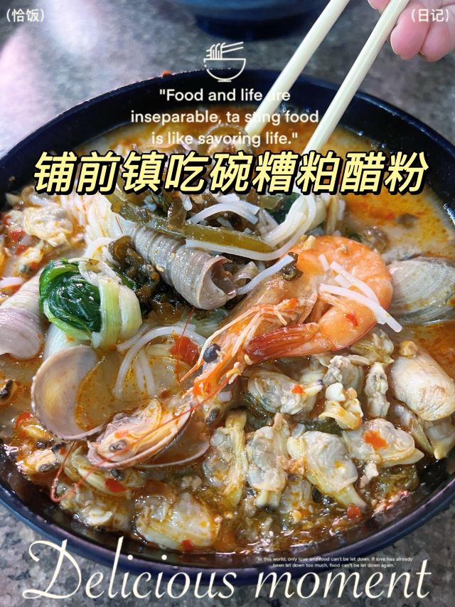 环境:特意从文昌回海口的路上绕来铺前镇,为了吃一碗正宗的糟粕醋,铺前镇上面全是卖糟粕醋的,选的这一家其实旁边有一家环境相对好一点,这家那种大排档式的环境,如果是夏天吃应该会有点热。 口味:其实本地人吃糟粕醋应该是过桥的吃法,就是单独的料,然后给你打一碗糟粕醋的汤,把它沾着来吃,可是这样也没有问我,就直接给我放在一起了,可能大部分游客都是这个待遇吧。 海鲜综合糟粕醋20元。海鲜的里面有一颗虾,有螺,钉螺和花蛤以及蛏子都是提早烫好放在那边的,吃起来新鲜度一般,还加了海草,海带和粉,主要是这些东西都是凉的,把这个汤浇进去,汤也是温的,我在其他地方吃过糟粕,醋是热的,热的就比较好吃。 全套综合糟粕醋20元。没这个全套综合的是猪和牛都有的,结果里面全部都是牛杂,就是牛肚那些有一点点腥味儿,然后加了一点点的花蛤和丁螺,比起海鲜的更不好吃一点,总体来说这家吃的很一般,不知道是不是因为没有吃到正宗的感觉,还没有在三亚吃的糟粕醋好吃。他家的斑斓糕4元一个反而蛮好吃的。