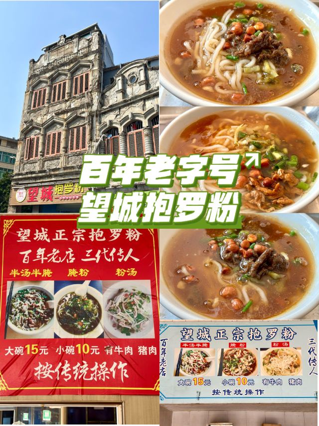 走遍天下XZ五年前第一次来文昌,就偶遇了这家“望城抱罗粉”,这次环游海南,故地重游,专门再来品尝一次,味道一点没变,还是老样子。 粉店开在一栋非常漂亮的百年骑楼的底层,仅一间门面,生意兴隆,自己找位子坐,然后进去里间厨房窗台上点餐,老爷子年岁已高,坐镇在桌子后的太师椅上,说起曾经来过,老爷子的话匣子也打开了,就像老朋友见面一样。 有三种说法,腌粉也叫拌粉,用牛骨熬制的纯卤汁浇在上面,口感浓郁,但稍显齁感,本地人的最爱。粉汤是加入海螺汤,偏清淡。半汤半粉,就是上面两种的结合体,大多数人都适合的口味。 抱罗粉是海南4大名粉之一,感觉最好吃的一个,“抱罗”是黎语,文昌下辖的一个镇,“望城”是文昌最有名的抱罗粉百年老店了,千万不可错过。