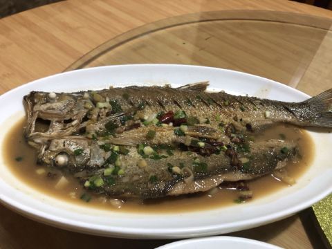 网上好评第一的店!从景区下来正好要经过门口!停车位充足,环境卫生!店里明码标价,有菜柜可以看着菜单和菜柜点菜,新鲜食材看得见!点了三个菜,大白鱼,步步高炒土鸡蛋,煎野菜豆腐都好吃!!!名副其实,第一名字至名归!下次还来
