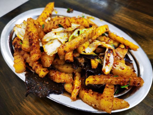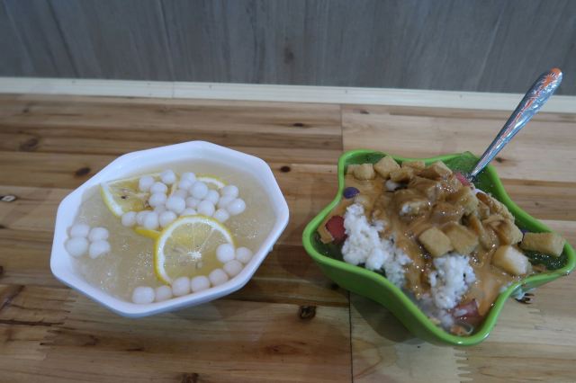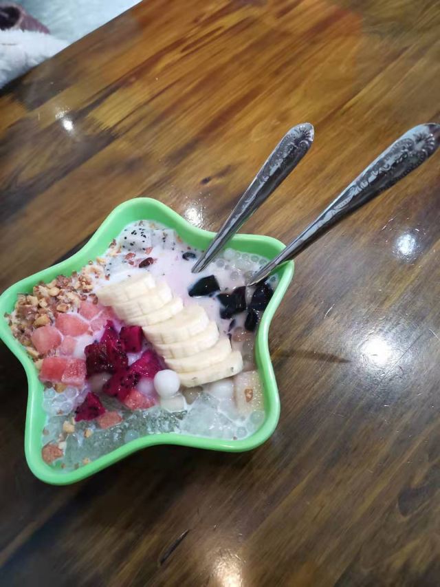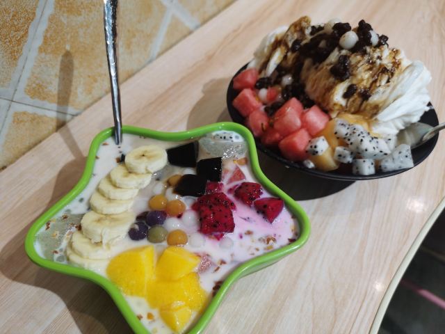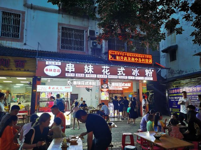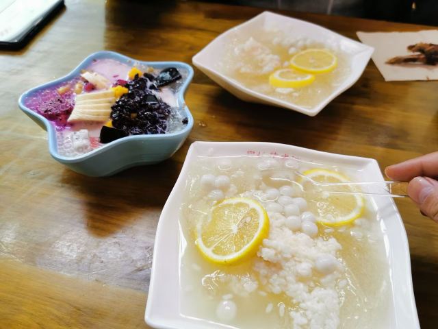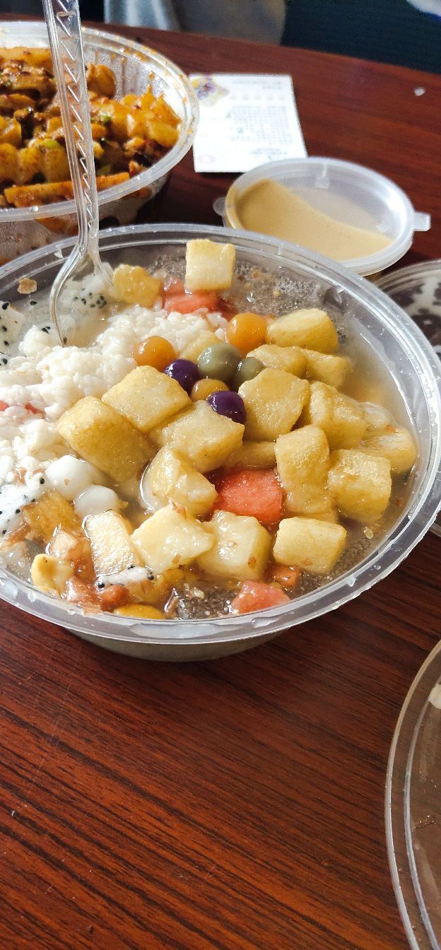 就在冯三嬢跷脚牛肉对面,晚上人很多要排队,做冰粉的几个小姐姐手脚都很麻利,不用等太久 丈母娘冰粉^招牌冰粉,给料很多,麻薯圆子水果等,讲实话这个味道不是自己喜欢的,甜的同时还感觉有一点点酸味,怀疑自己味觉有问题了,完全比不上在重庆吃的山城老冰粉 三鲜冰粉^这个做得很喜欢,柠檬香很好的融入到冰粉里,小丸子也好吃 花式西米露^和椰奶味雪花冰这两个是之后在分店吃的,很好吃,甜度合适,非常推荐 狼牙土豆^这个要的糖醋麻辣口味,特意让炸得软一点,味道还是过关的 去乐山的话,还是蛮推荐去这家冰粉店尝一下,雪花冰一定要点,口味有很多种,我觉得应该都挺不错