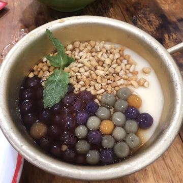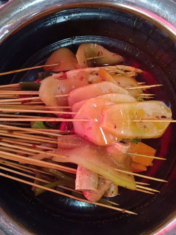 古藤幽兰奎星楼街,因为一家店带红一条街,目前火势不减。不想排长队,提前一个小时赶过来,其实还是一个等,先后而已。每天中午11点半左右可以开始点餐,早上备餐时间约一个多小时,大家各守其位,各司其职,有条不紊,忙而不乱,蛮好。没有选择单点,腰啊肚啊头啊脑啊之类的,不大感兴趣,就直接点了串串,签子已用皮筋捆好,没得选择,多与少就这么着。锅底汆烫只有一种口味,就是油+辣,不需要蘸料了,服务员说香油能解腻,我反正不信,锅里捞出来直接吃吧,热烫油辣咸,五全,深悔点多了,撑着吃完,冬瓜南瓜土豆已经很烂了,几乎捞不上来,其余正常,吃好后服务台数签结算,这么多签子是数不起的,尤其是人狂多的时候,店家都是称重,如果直接从油锅里捞出来,就会多算数量,怪不得很多人都是把签子晾在一边,我们也是不懂,提前数数好,结果称重多了5块钱,才明白过来。每桌加收一块钱一次性签子,俩人合计花了32块。舒服了我的小舌头,可怜了我的小胃口啊。临走时,两边座位均已爆满。颇有燎原之势啊。尝过了,了愿了,走了。