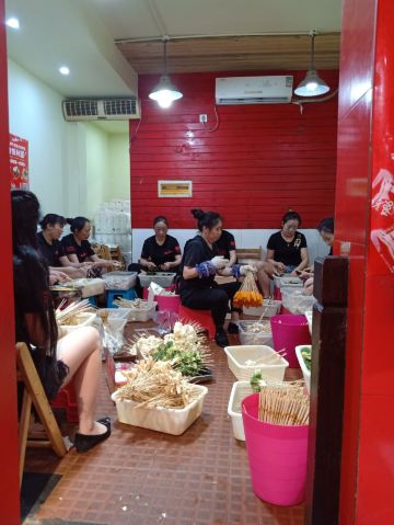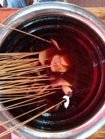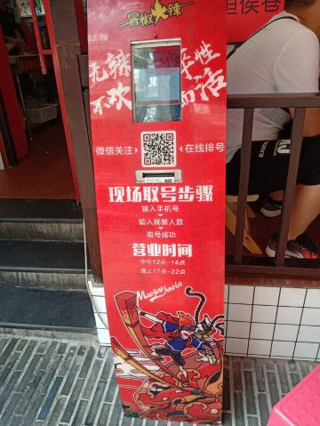 MAOJIAOHUOLA奎星楼街,因为一家店带红一条街,目前火势不减。不想排长队,提前一个小时赶过来,其实还是一个等,先后而已。每天中午11点半左右可以开始点餐,早上备餐时间约一个多小时,大家各守其位,各司其职,有条不紊,忙而不乱,蛮好。没有选择单点,腰啊肚啊头啊脑啊之类的,不大感兴趣,就直接点了串串,签子已用皮筋捆好,没得选择,多与少就这么着。锅底汆烫只有一种口味,就是油+辣,不需要蘸料了,服务员说香油能解腻,我反正不信,锅里捞出来直接吃吧,热烫油辣咸,五全,深悔点多了,撑着吃完,冬瓜南瓜土豆已经很烂了,几乎捞不上来,其余正常,吃好后服务台数签结算,这么多签子是数不起的,尤其是人狂多的时候,店家都是称重,如果直接从油锅里捞出来,就会多算数量,怪不得很多人都是把签子晾在一边,我们也是不懂,提前数数好,结果称重多了5块钱,才明白过来。每桌加收一块钱一次性签子,俩人合计花了32块。舒服了我的小舌头,可怜了我的小胃口啊。临走时,两边座位均已爆满。颇有燎原之势啊。尝过了,了愿了,走了。