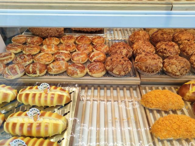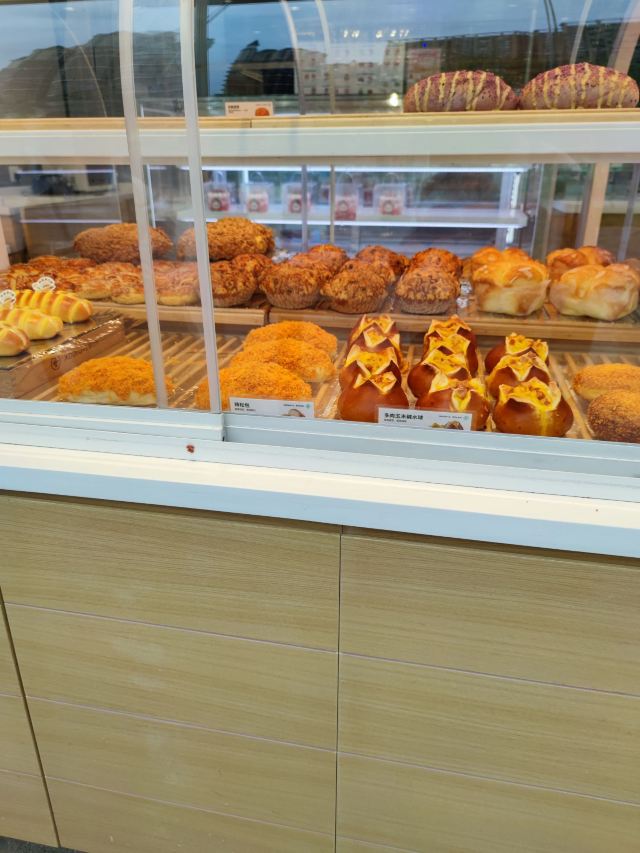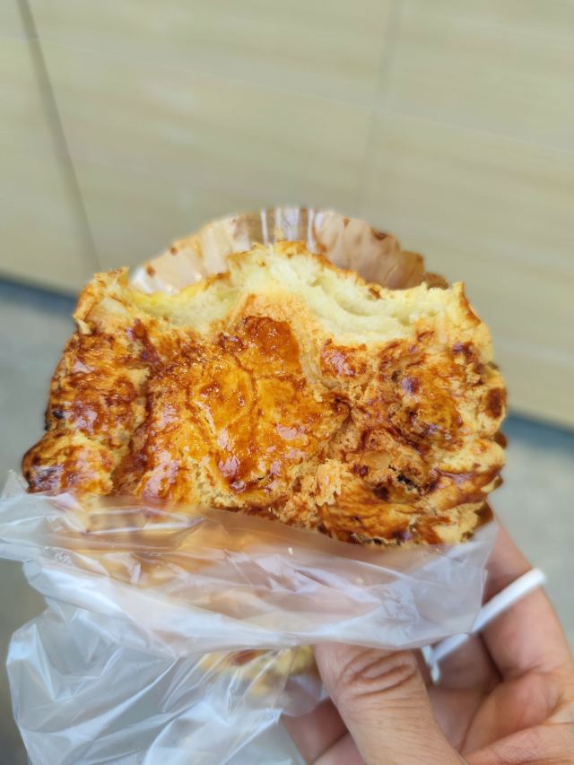 去这家店,正遇到店员师傅烤了老婆饼和中间那张照片的面包端出来(现在也不知道这叫啥面包),很鲜的两款点心,还是很热的,用店里发的夹子去夹,都夹不起来,后来是师傅用手帮我们拿的(带了手套),就在店里就吃了。