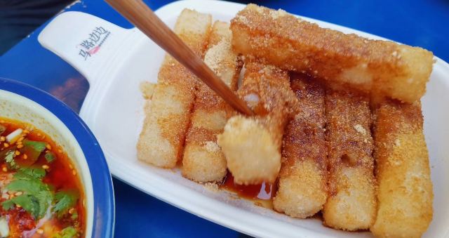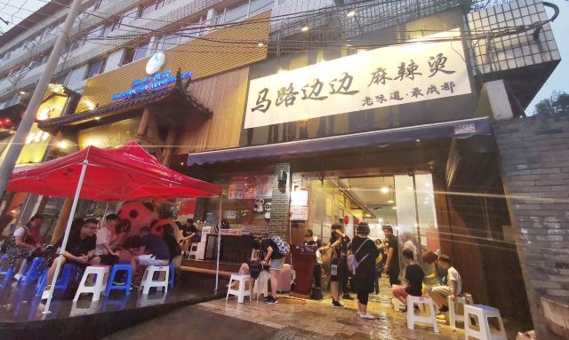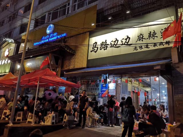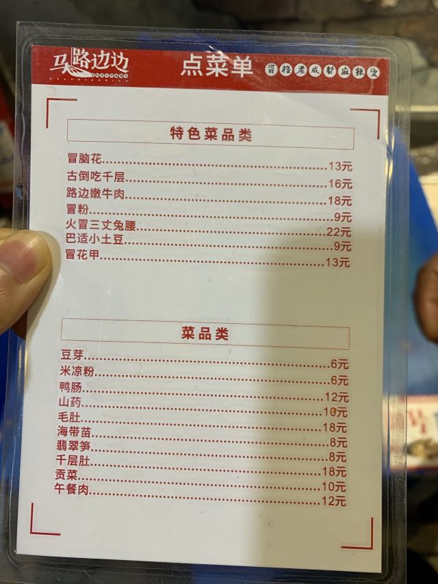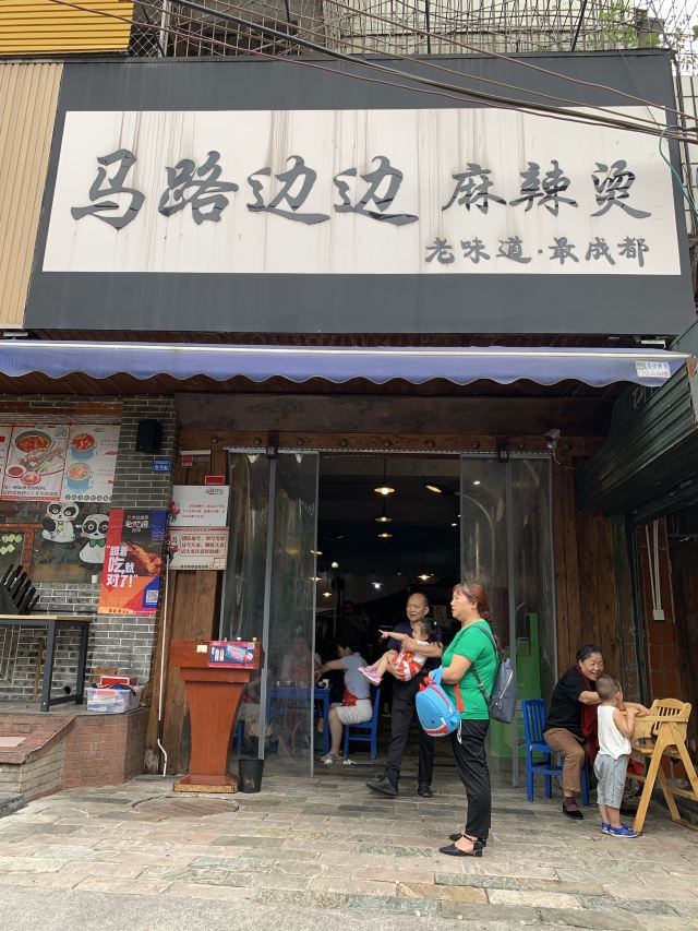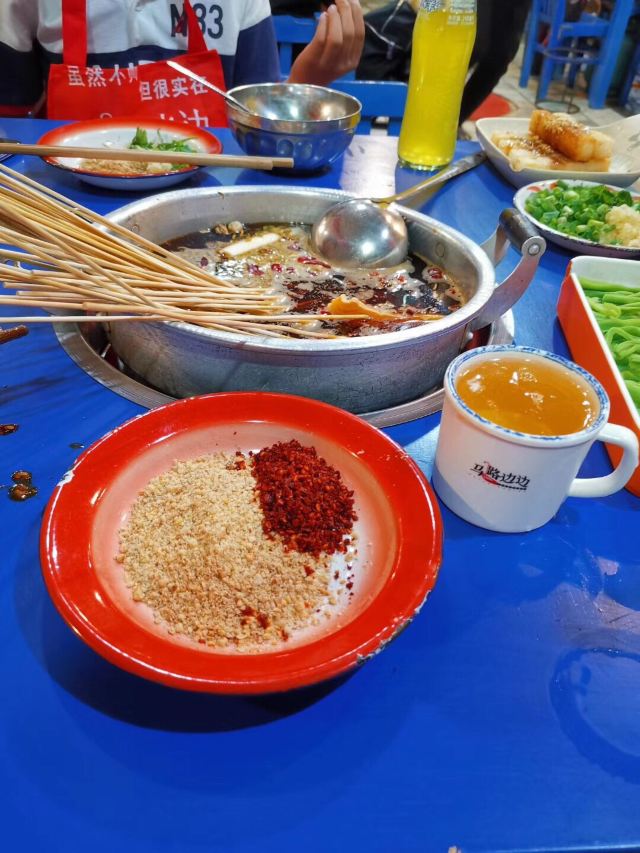 咛咛子都说撸串,是对夏天最起码的尊重。撸串这事,这成都的表现方式也是多样化。麻辣烫串、烧烤串、钵钵鸡串等等,无串不欢。 麻辣烫串串锅,也是撸串的经典之一。马路边边麻辣烫,当地朋友也很爱的一家麻辣烫,包括国际友人都爱。马路边边麻辣烫的环境是还原八九十年代街边场景的装修风格,蓝色的小板凳小桌子,是马路边吃饭的即视感,随和接地气。同样也是一到饭点,就满座,而且还是工作日的中午。 两大冰柜的串串种类很多,各种肉签子整合放在第一个冰柜里,素菜类放在第二个冰柜里,阿姨添加食材也很勤。冰柜的冷气十足,能保持食材在一定时间里足够新鲜。自助挑选自己爱的串串,点了份经典红油锅底开涮,配上辣椒面和花生酱的蘸料碟。 马路边边的几款小食,我觉得都挺好吃的。比如这个千层肚,全都被辣椒重重叠叠铺满,每一块千层肚都均匀挂满了辣汁,不辣是不可能的,辣哭是绝对的!入口爽辣十足,欲罢不能。吃一口千层肚,来一口酸角汁,痛快! 吃完辣的麻辣烫和辣的小食,这时来一份不辣的奶酪玉米酥,味蕾得到强烈的对比和暂时性的释放,简直觉得好吃到飞起~奶酪玉米酥,外酥里绵,里头的玉米奶酪馅,香甜香甜的,很好吃,还不腻口~ 马路边边麻辣烫,即使生意火爆,也还是保留0.5元一签的价格,价格亲民感人~