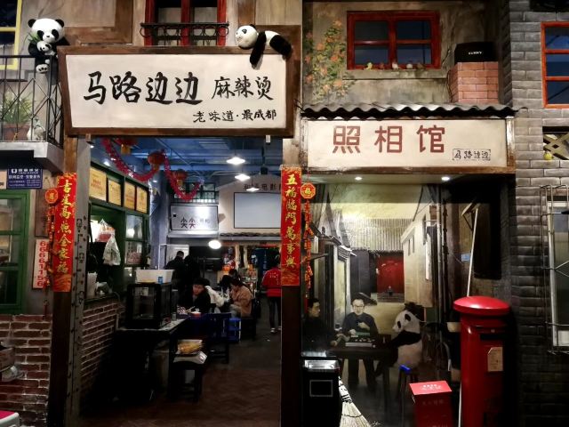 上山下海的茵茵风格 "马路边边"是一个连锁品牌,它在成都有好多家分店,而这家位于致民路的直营店绝对能称得上名副其实的"网红店"!这家"马路边边"门面不大,除了门口有两只"国宝"比较吸睛外,外面看上去有点其貌不扬。走进店内才发现竟然"内有乾坤"!无论是墙上的彩绘,还是有年代感的老物件,在这里用餐仿佛置身八十年代的成都街头,很有意思!和其他一些网红店不同,这里的人气很踏实!我发现,这里的食客年龄跨度很大,从几岁的小朋友到花甲老人都有,真的是一家很受本地人欢迎的餐厅啊!