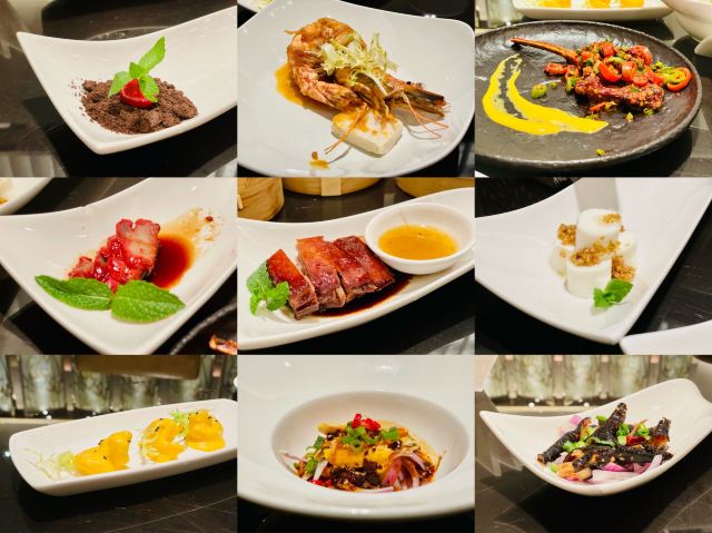 JW MARRIOTT HOTEL CHENGDU·MAN HO成都万豪系酒店的中餐厅好像特别喜欢做点心任点任食,包括丽思卡尔顿、瑞吉、W、丽都喜来登、JW万豪都在做点心自助,除了丽都喜来登做川菜点心自助以外,其他几家都在做粤式点心自助,丽思卡尔顿、W、丽都喜来登只坐午市点心自助,瑞吉和JW午晚市都做。 推荐指数 ⭐️⭐️⭐️⭐️⭐️ 🖼餐厅环境: 餐厅大厅座位并不多,但大厅是可以看到中厨房内部的情况,虽然只能不能看得很清晰,但起码在万豪系的酒店的中餐厅中,真的很少能做到让吃客能知悉餐桌上的菜是怎么做出来的。 💰人均消费: 门市价358/位,点评价188/位,含菊花茶,价格上面比成都瑞吉要实惠。菜单79道菜,其中8道JW万豪尊享(每人尊享一款)。 🍲菜品推荐: 【JW万豪尊享】 川椒香煎草原羊排 深海虎虾(金沙酱焗) 樱桃鹅肝 川椒香煎草原羊排,真的挺好吃的,外焦里嫩! 深海虎虾(金沙酱焗),摆盘一般! 樱桃鹅肝,蛮可爱的嘛! 【广东靓汤】 冬瓜薏仁老鸭汤,在酒廊也有喝过,作为例汤还可以! 【开胃前菜】 鲜椒去骨鸡爪,黑凤爪。 蓉城棒棒鸡,跟口水鸡差不了多少。 桂花山药,吃起来不像山药,像布丁的口感。 【川粤时光】 香芒汁脆虾球,味道蛮不错。 黄田坝小笼粉蒸牛肉,个人不太喜欢吃粉蒸肉。 【粤式烧味】 蜜汁炭叉烧,偏瘦,瘦叉烧其实也挺好吃的。 深井烧鸭皇,烧鸭皮脆脆的,口感与瑞吉的对比各有喜好吧。 【JW万豪精选】 JW万豪虾饺皇,虾饺皮太容易破了。 蚝皇叉烧包,叉烧包的味道还可以,有叉烧味。 熊猫流沙包,可可爱爱你样子。 麻辣金钱肚,味道一般,没有瑞吉那么独特,正常的粤菜口味。 名酱蒸凤爪,正正常常。 黑椒牛仔骨,正正常常。 鱼籽鲜烧卖,正正常常。 梅子蒸排骨,正正常常,更喜欢吃芋头蒸。 荷香糯米鸡,糯米鸡的馅一般。 泰式咖喱鱼蛋,鱼蛋的口感其实蛮正中,很有弹性。 【点点心意】 XO酱炒萝卜糕,XO酱好像没有吃到,很烫口,放凉点好吃。 巧手榴莲酥,看卖相点的。 【肠粉】 香茜叉烧肠粉,里面的叉烧挺多。 【甜心美意】 太妃杨枝甘露,像简易版的。 红莲姜汁炖雪蛤,还是喜欢喝雪耳。 蒸点是一起上,拍几张集合完全没有问题。所有的点心按个上,这样的点菜方式不会浪费,如果一人食的话也很合适!每一道菜的分量会比瑞吉的上,不过任点任食的话,小分量合适单身人士!