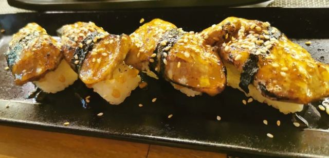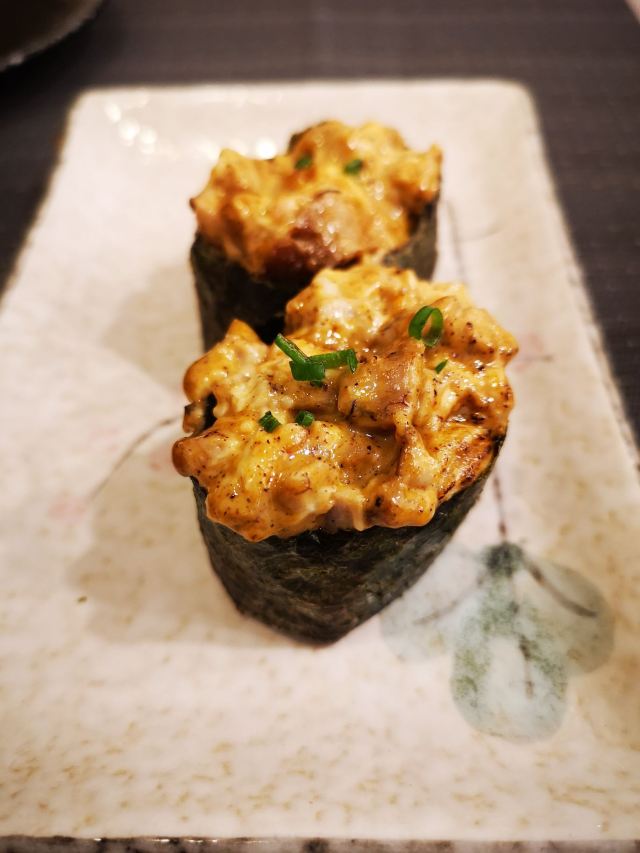 和风豆腐,象拔蚌寿司(两枚),天妇罗鲜虾寿司,蟹肉寿司(一枚),豚骨拉面 加辣,鹅肝寿司(两枚),黑椒脑花寿司(两枚),鳗鱼寿司(一枚),榴莲芝士寿司(一枚),三文鱼刺身,鳗鱼饭,豚骨拉面,大天狗鹅肝饭,牛油果鲜虾卷,宝藏玉子烧