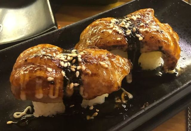 饭团匠,确实主打是各种寿司,脑花儿寿司听起来恐怖,处理得一点腥味都没有,我最喜欢榴莲寿司,冰镇的榴莲肉中间加了一层冰皮,大爱。总体寿司都无可挑剔,但是刺身很一般,我是说食材本身,价格比较便宜也就不计较啦。