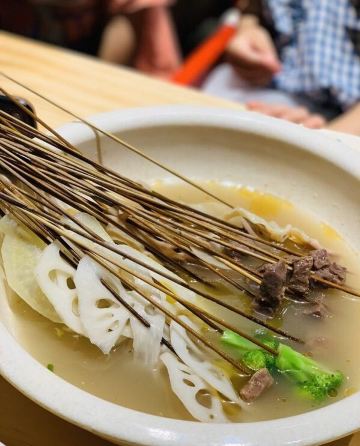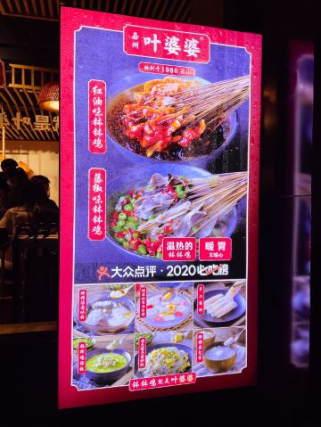 心灵宫殿《41年来,唯一不变的就是那种味道》 最近抖音上非常火的钵钵鸡成了网红,它是成都最近几年非常流行的特色小吃,一听其名,就觉得很新奇。 说到这家叶婆婆钵钵鸡算是成都最火的一家代表,经常上各种美食网站的必吃榜,算是网红店。太古里店位于锦江区油篓街48号附1号,在远洋太古里边,我从峨眉山旅游回成都,一路奔途过来,到了门口已经过饭点了,依然还排长队,果然很火。 好在可以先点单,话不多说咱就开始吧。店内装修清新明亮的原木风,暖黄的灯光使就餐环境很小资。店内铭牌和菜单上无不一刻说明叶婆婆钵钵鸡的历史,始创于1980年乐山,以及叶婆婆起源的故事,乖乖创店超过40年的历史,比我们年龄都大得多。 叶婆婆家的钵钵鸡汤底有2种,红油味钵钵鸡和藤椒味钵钵鸡,虽然很多人推荐红油味,但个人更喜欢藤椒味,一次性汤底竹签一个人才3元,荤素0.7元/串,很便宜。就餐是自选模式,食品柜里可选的品种真的很多,分量也很足,菜品摆放整齐,而且很干净,自助拿菜,然后报桌号交给服务员加工。还根据网站推荐的点了招牌特色臊子蛋炒饭,老红糖冰粉等,因为只有一个人就餐,无法点更多的美食,只好作罢。 钵钵鸡的灵魂就是那一锅汤底,汤的味道十分鲜香浓郁,配料也都是现点现调。因为不喜欢吃重辣多油,藤椒味真的很适合。青花椒的香麻和汤汁的鲜美搭配在一起,微辣带麻,一点都不油腻。 串串选了黄喉,牛肉,毛肚,响皮,莲藕,青笋,无骨鸡爪,小肝郡,牛肚,魔芋……每种都拿一样,全部吃个遍,才算不枉此行。用这清爽的灵魂藤椒汤底去涮各种的串串,简直清爽到让你把持不住青花椒味! 特色臊子蛋炒饭,不愧为店内招牌,不能不点,每一桌上都有这一大盘炒饭,好大一份,炒得粒粒分明,饭粒晶莹剔透,入口喷香四溢,跟钵钵鸡是绝配,太好吃了! 老红糖冰粉,在如今冰粉大多花哨的今天,但它始终不变保持着那份朴实的老红糖味,可口爽滑。 人的味蕾是不会骗人的,舌头会让你一下子就能记住了这个味道,非常的独特和纯粹。叶婆婆钵钵鸡,41年来,唯一不变的就是那种味道! 小贴士: 交通:成都地铁2号线【东门大桥】站D2出口或2/3号线【春熙路】站B出口; 推荐指数:五颗星 特色菜推荐:招牌特色臊子蛋炒饭必点,老红糖冰粉,老红糖凉糕,謬糟荷包蛋等,钵钵鸡汤底有2种,红油味钵钵鸡和藤椒味钵钵鸡,看个人口味选择,不过人多时可以2种都选。