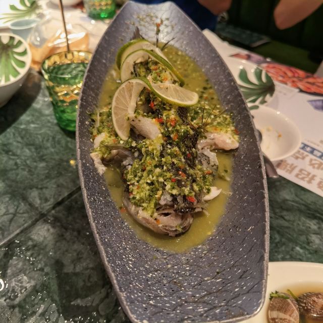 同学的儿子小升初摇号进入了名校,请闺蜜欢聚集渔共享欢乐时光。 群光百货对面二楼,场地还是比较大,给我们安排的包间,感觉空调不足。集渔的特色免费甜品,吃的肚子撑起,不想吃主食。 点的冬阴功和花胶鸡双拼,冬阴功一如既往的好吃。 咖喱虾,咖喱得劲,好吃。 泰式青柠鱼,鱼肉鲜嫩,酸甜可口。