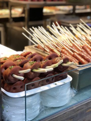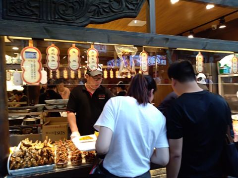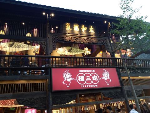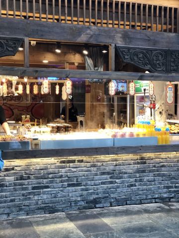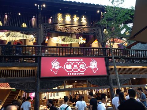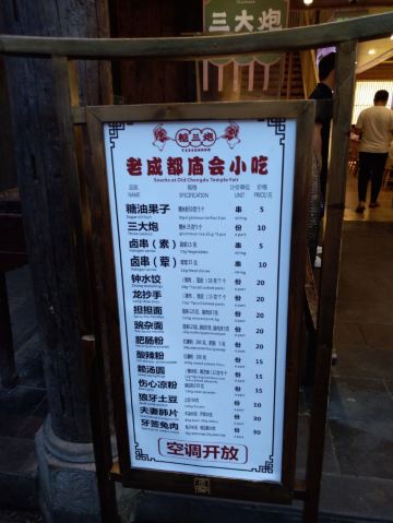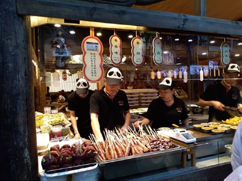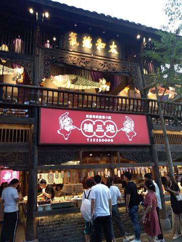 在景区内开的一家售卖美食的铺子 分为上下两层,一楼主要是买各种小吃 每个小吃窗口都有店员吆喝吸引外地游客 刚好陪同外地朋友过来闲逛,他们对脑花很感兴趣 但是,他们不敢吃,感觉很恐怖 只是脑花真的好吃,哈哈,又没有其他味道 尤其是在火锅和烧烤中 问了下他家的脑花:30元一份 omg,30元!电子科大的脑花可以买两份了 虽然开在景区,但是这个价格真的惊到我了 买了一份,口感一般,脑花烤的有点老了 比较入味,但是失去了软糯的口感 另外他家还有三大炮售卖,一份15 单个5元,这个价格一般 个头比较大,外地游客感兴趣,砰砰砰的声音比较特别吧。 还有一道小吃比较酷,猪鼻孔插葱,我的天 我反正不敢吃