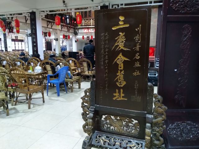 悦来茶馆曾是川剧著名班社三庆会的驻扎地,建于1909年,至今已有百年历史。如今,茶馆成为了川剧票友们的聚会地点。在略显昏暗的茶社内喝一口茶,听票友们哼唱拿手的川剧唱段,十分舒服闲适。 悦来茶馆共有两层,底层的中央处搭建着一个戏台,戏台直通向二楼的天井,白天里总会有天光射下来,烘托出整个茶馆的恬静气氛。每周六下午2点,成都川剧院都会在这里演出川剧折子戏,吸引无数戏迷前来。