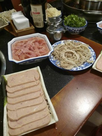 嫩牛肉,火锅牛排,鲜毛肚,千层肚,脑花,午餐肉,猪黄喉,鸭血,红油锅底,鸭肠,鳝鱼,卤肥肠,鹅肠