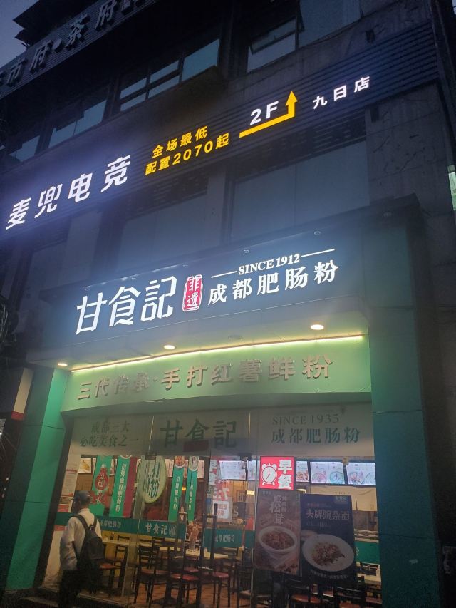 成都天气越来越冷了。正好是吃肥肠粉的时候,今天晚上就到这家老店来开吃,这家店应该是成都第一家甘食记,20年前就吃过他家,20现在来吃,味道依然很棒,肥肠粉麻辣鲜香,肥肠软糯入味,吃一口下去身上寒意全无。
