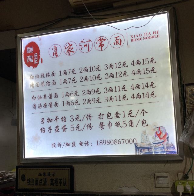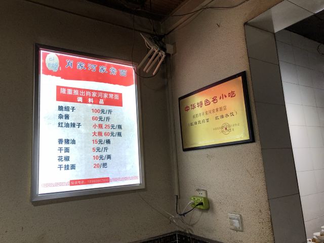 Xiaojiahejiachang Noodles (xiaojiahebeijie)从1993年小学,吃到2019年,店又重新装了。去年把老房子租出去,搬家了,就不太方便过来吃。 为了吃面,专门打车过来。以前出差前,每周至少吃一次,现在估计每两个月,专门打车来吃一次。 担心重新装修后味道会变,发现完全没有。还是熟悉的味道,太J儿好吃了,原谅我比较夸张。它家的面比较粗,有点像藏面,所以很多藏族朋友来吃。 红油,清汤都不错。我个人更倾向清汤。一般去点都是标配,2两红油,2两清汤。这次吃,红油味道更棒了。