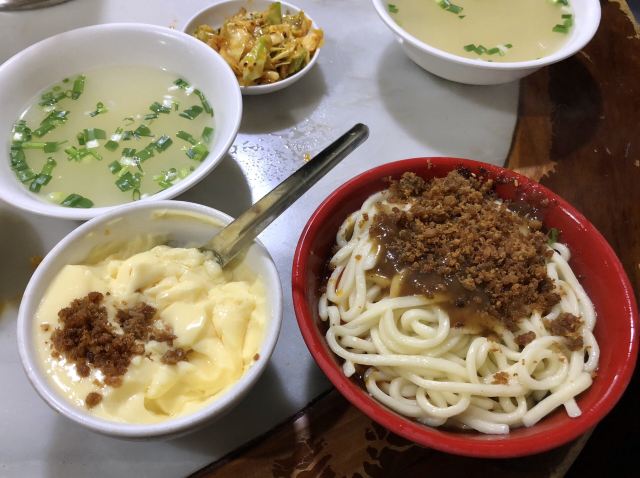 碗蒸蛋,吃不饱的面,红油抄手,红油脆绍面,绍子蒸蛋,泡菜,红油杂酱面,清汤脆哨面,清汤面,臊子蒸蛋,干拌饺子,炸酱面,清汤杂酱面