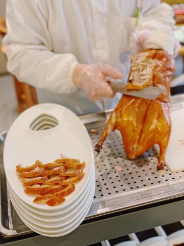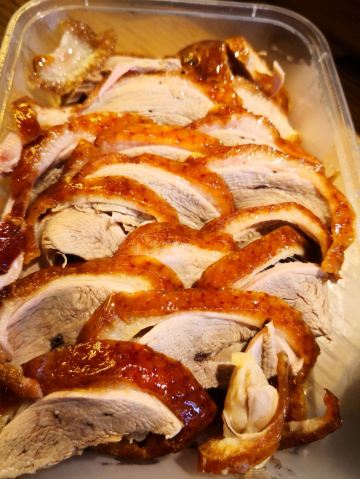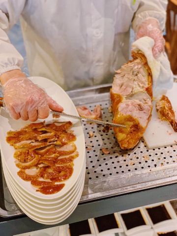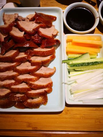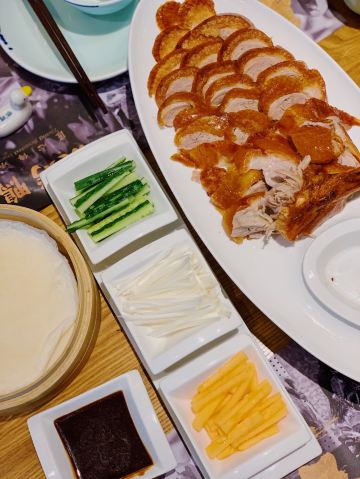 Zhang Roasted Duck三八节,带太后一起来过节。从家步行十分钟就到,今天过节,排队的人有点多,小等了一会。前面很多人主动要求拼桌,所以很快就就坐了。 来张烤鸭,直接上鸭子,点了一整只鸭子,156元,从实惠的角度讲,吃了鸭子后的鸭架可以带回家让家头的男同胞啃哈哈哈。 因为是新鲜烤制,鸭子等了一会,师傅会在你面前片好鸭子,肉片本身只有肉香味,加了面酱后特别好吃,放进面饼加上黄瓜,葱丝,一定要一口咬下才过瘾。 鸭架子打包,回家做了香煎鸭架和鸭架豆腐汤,非常好吃。同学们可以回家试试看。