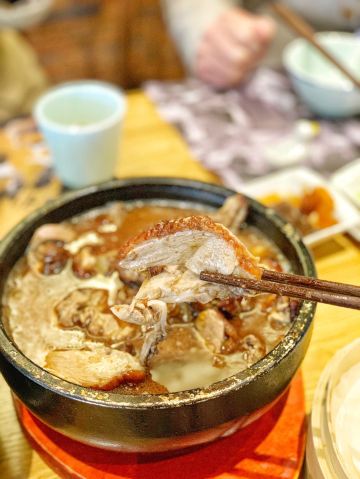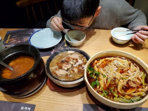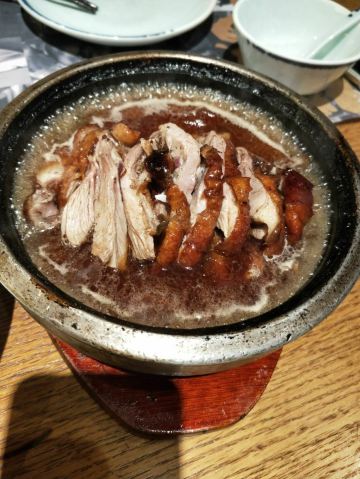 dangdang成都必吃榜餐厅,老字号了。 环境一如二十年前,口味都没怎么变过,招牌菜还是那些。当然有了不少新菜。 生意不错,饭点儿还需要等位。我很幸运跟别人拼桌,没排队就吃上了。 服务没的说,特别照顾客人,很热情。 口味方面,不知大家为啥都推荐冒烤鸭,真心一般般。不过实在的是,一小份冒烤鸭包含了一个鸭腿,算是良心了! 白果炖鸡汤,强烈推荐!上桌后打眼一看,就是纯纯正正炖出来的鸡汤,上面泛着鸡油。一口下肚,浓浓的鸡汤味儿是任何香精都仿不出来的。遗憾的是也加了味精鸡精,其实原味儿多好啊!不管怎样,这口鸡汤征服了我。 藿香鲫鱼,让我心心念念的家常川菜。其实川菜里有很多经典,比如火锅,串串,冒菜,开水白菜,回锅肉,都会让人想起来就食欲大增。但真正让我念念不忘的,就只有藿香鲫鱼。鲫鱼,应该是鲜中之王了,个小、肉嫩、多刺、味鲜,是它的标签。小时候不爱吃,因为刺多,后来发现鲫鱼的鲜美之处,也不多吃,还是因为刺多。这道藿香鲫鱼,就两条,二两左右的小鱼,整整一大锅调料,精心烹制,就为了煮出鱼的鲜美。藿香用的非常巧妙,独特的香气,让原本入药的植物,入撰后立马神奇起来。看上去简单的家常菜,其实才是一个地方真正的味道。 腊味三拼,服务员给的菜单上没有这道菜,我是在楼下看到才点的。原本是馋腊肉,看到晶莹剔透的大肥肉,口水就下来了。结果上桌后发现,腊肠和腊排骨更棒!尤其是腊排骨,有肥有瘦的部分,想得不要不要的。光是这道菜就能干下去二两小酒。