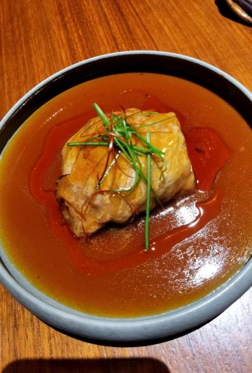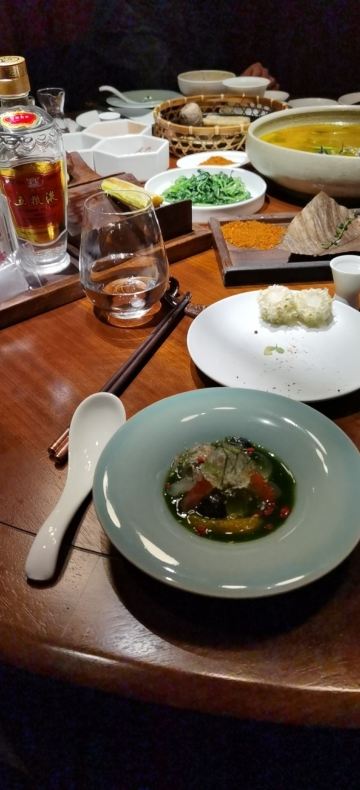 zhuang yoyo假期即将结束,选择了成都比较有特色的廊桥吃饭,门口挺惊艳,喜欢古色古香建筑,一上去前台会带领进入餐厅里,长过蛮有感觉,里面装修桌椅也是选择原木色为主。 关于食品: 冷味三款 「凉拌虫草花」、辣椒鲍鱼、凉拌牛舌 :分量不多,摆盘好看,味道一般,虫草经过油炸过,有点过腻。适合餐前 「炎味糯米脆皮鸭」 糯米和表层脆皮鸭,支持到软糯,没又脆皮鸭口感 「炎味石锅笋壳鱼」 剁椒,笋切成丁,表面撒满葱花,掩盖了鱼本身鲜味,口感一般,鱼肉很碎,不出奇。 「炎味脆皮乳鸽」 乳鸽火候火大,很干很油 藤椒蛤蜊丝瓜 色泽好看,绿油油,味道清淡爽口,价格和味道不成正比 「暖心豆腐杏仁茶」 非常一般,没有任何特色,口感单一 总结:非常一般的餐厅,环境也非常一般,没有高级感,食品以创意为主,但是我看不到任何惊喜,至于味道一言难尽,真不如去吃顿火锅爽。
