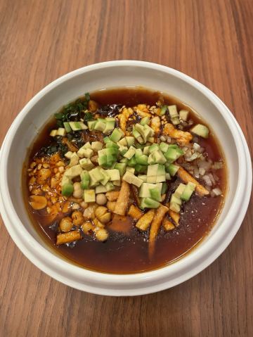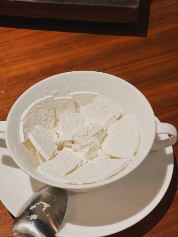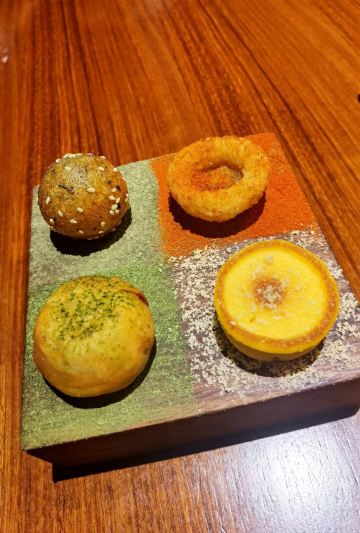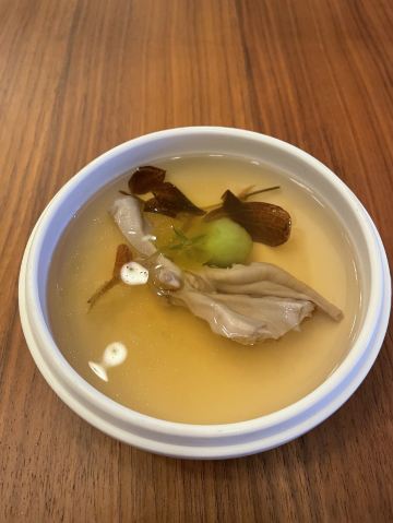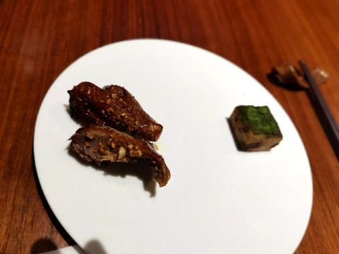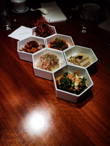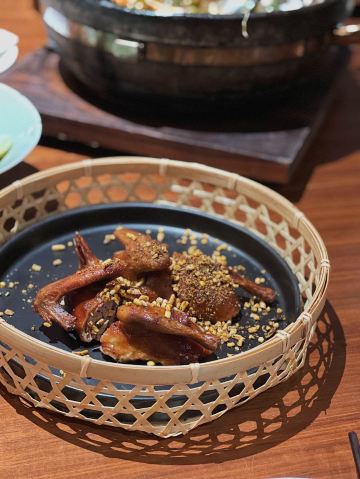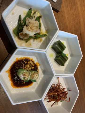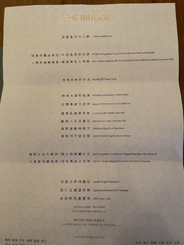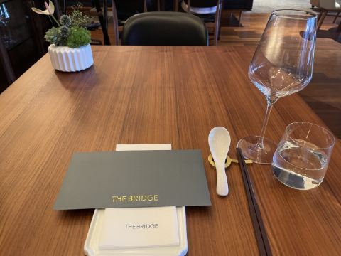 THE BRIDGE假期即将结束,选择了成都比较有特色的廊桥吃饭,门口挺惊艳,喜欢古色古香建筑,一上去前台会带领进入餐厅里,长过蛮有感觉,里面装修桌椅也是选择原木色为主。 关于食品: 冷味三款 「凉拌虫草花」、辣椒鲍鱼、凉拌牛舌 :分量不多,摆盘好看,味道一般,虫草经过油炸过,有点过腻。适合餐前 「炎味糯米脆皮鸭」 糯米和表层脆皮鸭,支持到软糯,没又脆皮鸭口感 「炎味石锅笋壳鱼」 剁椒,笋切成丁,表面撒满葱花,掩盖了鱼本身鲜味,口感一般,鱼肉很碎,不出奇。 「炎味脆皮乳鸽」 乳鸽火候火大,很干很油 藤椒蛤蜊丝瓜 色泽好看,绿油油,味道清淡爽口,价格和味道不成正比 「暖心豆腐杏仁茶」 非常一般,没有任何特色,口感单一 总结:非常一般的餐厅,环境也非常一般,没有高级感,食品以创意为主,但是我看不到任何惊喜,至于味道一言难尽,真不如去吃顿火锅爽。