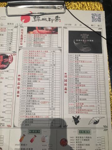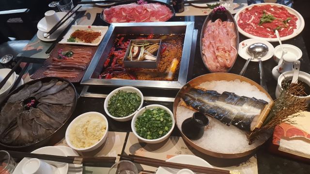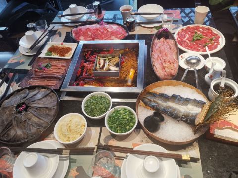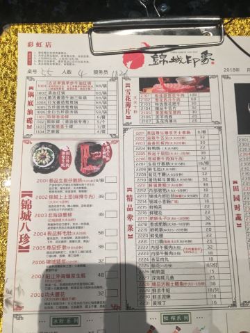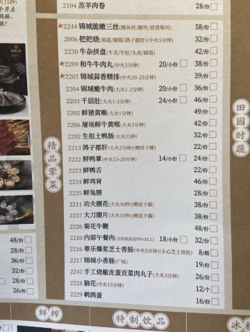 鲜毛肚,锦城嫩牛肉,鲜炸黄金六两酥肉,冷锅鲜血旺,养颜冰粉,极品生扣鹅肠,北海道蟹柳,功夫腰花,内部午餐肉,虾饺,芝麻飞饼,香豆腐,耗儿鱼,梅林午餐肉,针笋,牛五花肉,豆腐皮,排骨,刀削面,五花肉,掌中宝,山药,鹅肝
