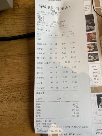 小菜旅途故事成都美食|携程美食林上榜餐厅之 锦城印象火锅 店名:锦城印象火锅(彩虹桥店) 地址:耍都武侯大街19号 营业时间:11:00-02:00 人均消费:120元 锦城印象火锅在成都也是有好多家分店,算是成都最老牌的火锅店之一了,最常去的还是位于武侯祠大街,耍都美食广场旁边的彩虹桥店。也是携程美食林上榜餐厅中,成都火锅为数不多的几家之一。 【关于环境】店铺是独立路边的两层楼,非常显眼,内部装饰也是古色古香的中国风,进来就感觉很舒服,二楼阳台户外位置可以看风景吹着风吃火锅,特别适合三五好友聚餐来这里。 【推荐菜】 1⃣️冰粉。有四种口味的,而且一个个颜值都很高,跟火锅简直是绝配。 2⃣️锦城上上签。名字很有特色,实际是正宗的香辣牛肉,麻辣鲜香,肉很大一坨,记得一定要沾上干碟一起食。 3⃣️鲜毛肚。必点菜,大片的毛肚,灯光下非常有质感,大火10秒左右开刷,味道很棒。 4⃣️生扣极品鹅肠。也是火锅必点的招牌菜,食材非常新鲜,上菜之前服务员还为我们现场表演了剪鹅肠,一点点的体验感让人觉得很有趣。 5⃣️心形的虾滑。下锅后Q弹爽滑。 6⃣️功夫腰花。刀工真的是相当精湛,一定要沾干碟吃 【关于服务】吃完了服务费还会主动来问我们感觉如果,有没有不满意的地方,感觉是一家特别用心在做餐饮的店。