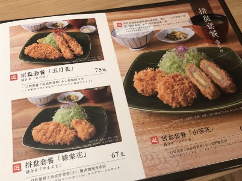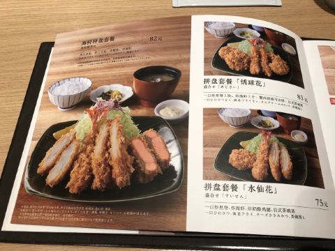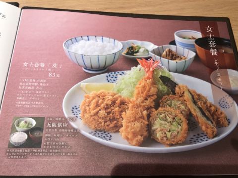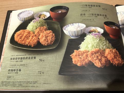蟹肉奶酪可乐饼,海鲜套餐,咖喱里脊饭,炸猪排,卷心菜,味增汤,炸大虾,里脊猪排饭,日式蒸蛋,背脊猪排火锅饭,炸三文鱼,炸一口里脊,里脊五月花