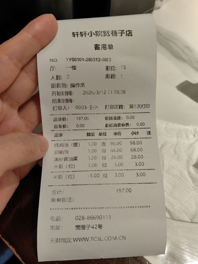 一年前带父母来过一次,当时印象还挺好的,所以这次四川行又来二刷,可惜……退步了,回锅肉明显不如巴蜀味苑。就线鸡汤还行吧,葱沫猪肝没预订所以这次没吃上。还不是被美食大V隋坡误导了,他没说要预订啊,还以为现在不用预订了呢。不过第二天去了另一家轩轩小院,猪肝大不如前,宫保鸡丁也大失水准,以后不会再去了,这次害我白白浪费了两顿饭的机会。