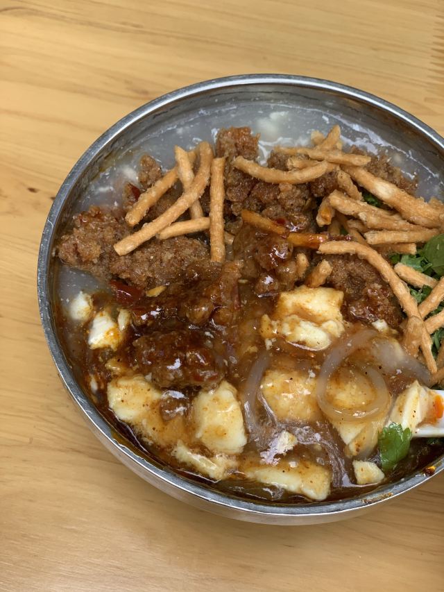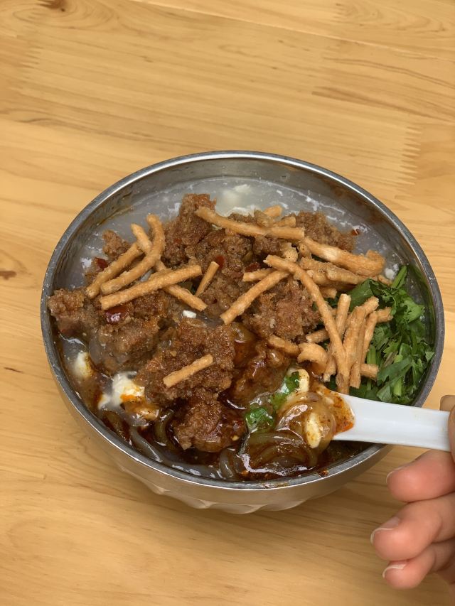 摩小亚总评: 推荐豆腐脑,是好吃的那种等级,食材丰富,口感层次饱满。 其他的我觉得一般吧,但是可以顺便一起尝尝。 建议错开饭点过去,因为那一排的餐饮都很火爆,会等比较久。 性价比:❤️❤️❤️ 评分:75分 这家店真的是收藏了很多年很多年,终于在今年的体检中途去拔草了。 华西体检早餐内容包括:一盒牛奶,一个白煮蛋,一个老婆饼,我的天,饥肠辘辘的我吃完还不够塞牙缝,所以果断出门觅食,吃完回去接着项目检查! 这家店离华西医院也就几分钟的步行距离,很方便的。 因为离医院太近了,我也不踏实,还是要有点距离比较好哦! 【鸳鸯咔饼】9元 这个虽说是店招牌,但是味道特别葡萄,饼子太厚,口感也并不怎么软绵,还好有加热,不然肯定更不好吃。 中间粉蒸牛肉+粉蒸肥肠还行,不算特别好。凑合可以吃吃。 【粉蒸牛肉豆腐脑】15元 这个我挺满意的。豆腐脑挺细嫩的,汤羹的浓稠度刚刚好,然后底料的辣油也比较香,再就是最主要的有脆脆的馓子和香酥黄豆。还有隐藏在最下面的红薯粉哟。 吃之前记得一定要搅拌均匀,一大勺入口,那叫一个丰富多彩呀! 【红糖醪糟粉子】7元 红糖得味道还是比较浓香的,醪糟也给的比较足。只是可惜了那个粉子那么大颗,竟让不带馅儿。 如果是粉子就小粒一点吧,如果是汤圆就带馅儿吧。 【豆花牛肉面】10元 对于豆花面我一直不是特别喜欢,总觉得黏糊糊的一碗面,吃起来,喝起来都觉得怪怪的。 嗯,豆花就是豆腐脑里面的那个豆腐脑。 面条就是一般的挂面。 整体来说,普普通通啦! 嗯,老板娘态度还不错,挺麻利的一位女士。也还是比较热情吧。 下周要去乐山吃好吃的啰!开心!