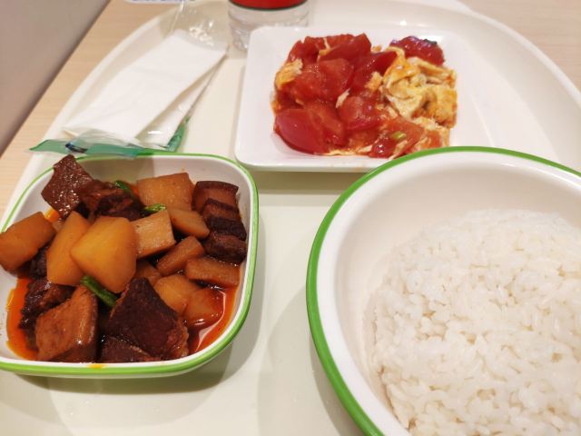 中午路过这家大米先生,想简单吃个午饭就进去点餐。 [环境]在三医院附近,中午客流不断。快餐店的标准装修风格,简洁干净。 [服务]基本属于自助式,喜欢哪个菜就自己端,然后去收银台结账。 番茄炒蛋和土豆烧肉味道都还可以,分量不大,一个人吃合适。 一荤一素基本人均消费在20元上下,主要还是环境看上去比较干净让人觉得比苍蝇馆子放心。