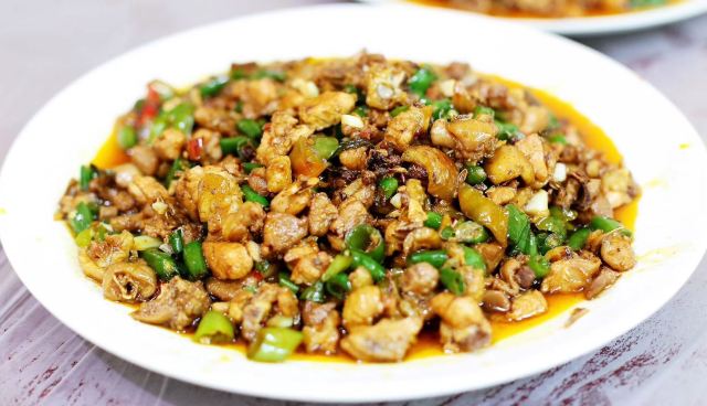 三道菜有名,辣子鸡(应该说青椒鸡)、干黄花菜煮水滑肉、番茄鱼。滑肉是老家红苕粉做的,农家风味,番茄鱼里面炒芝麻撒很多也可以,最佳必须是辣子鸡,吃完一大盘,舍不得吃完打包回家晚上吃了一顿,现在渣渣还留着明天中午加鸡肉再炒一顿,可见一斑。