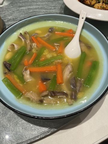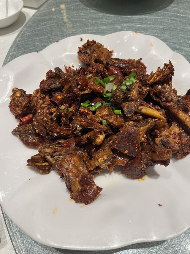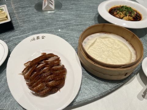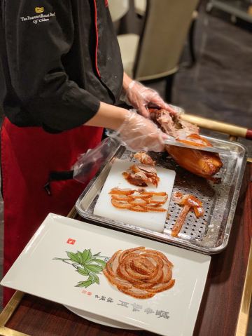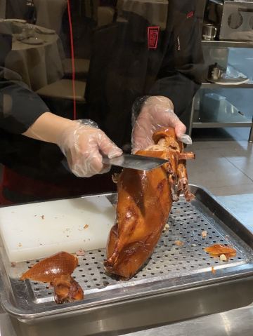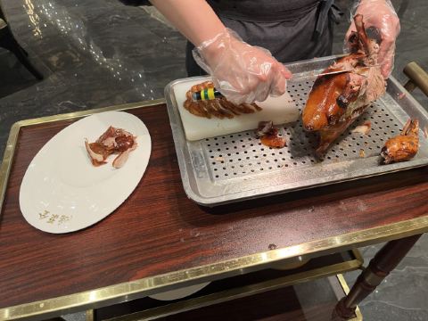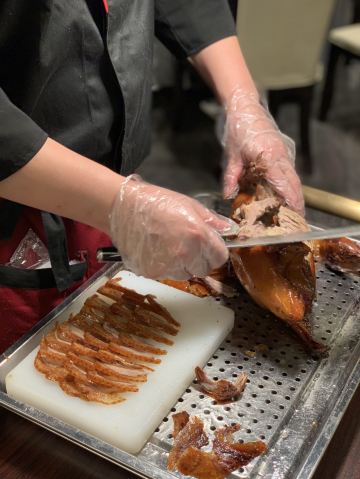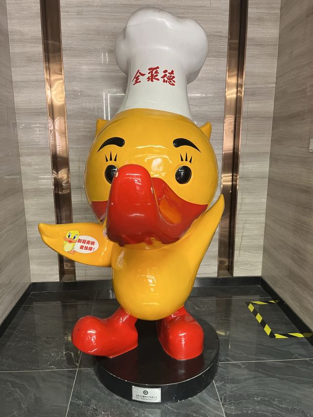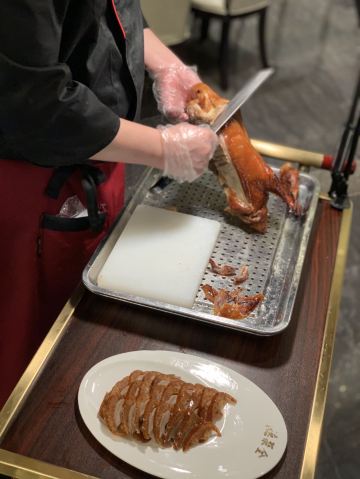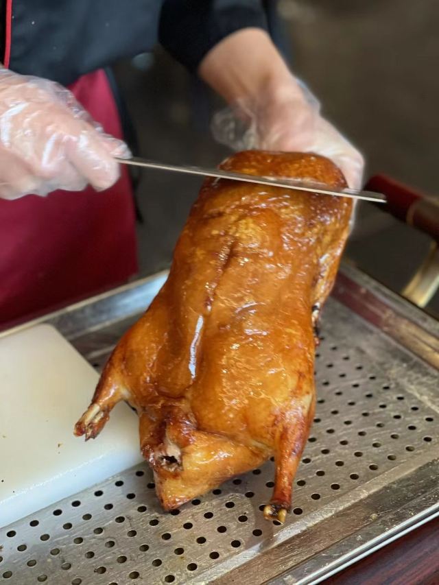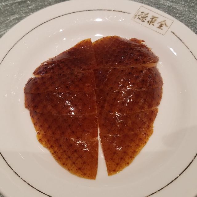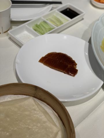 摩小亚全聚德悄悄咪咪的就在成都落户了,好多人恐怕都还不知道吧。 虽然很多人对于烤鸭吃全聚德有些嗤之以鼻,但是毕竟人家的名气还是享誉全球的,也算是北京烤鸭的鼻祖级品牌。 况且,成都也没几家烤鸭特别特别好的店,所以如果想吃烤鸭了,这家其实是值得打卡的哟! 至少,我觉得他们家价格不贵,烤鸭算是好吃的。 我是母亲节那天中午去的,特意带着妈妈去吃烤鸭,生意很火爆哦,大中午的排队很壮观。 【北京烤鸭半只】88元 烤鸭半只的价格真的好实惠,如果两三个人去吃,真的超划算呢。 即便是一个人馋了,想去吃烤鸭也是毫无负担的呀。 实话说,不算惊艳,但是在成都吃到这个水平,我是满足的。 【荷叶饼】10元 饼子是两片中间有各片,所以不会出现好几张饼皮粘连的情况。 可是荷叶饼的口感有些干硬呢,所以不是太好哦。 【咖喱虾仁锅巴】88元 虾仁是真的很大只,可是一份只有6只哟,所以有些略显不够吃。 咖喱的味道还不错,多么大一个盘子,里面有巨多的土豆条,完全不好吃,软不是太软,还炸过的,很鸡肋,随便放什么也比这个配菜好。 但是呢,装饰用的那个巨大锅巴还不错呢。香香脆脆的,蘸着咖喱酱汁吃,特别好。 【老北京酸辣鸭血汤】32元 这个我觉得还行,但是呢我对血这个食物没兴趣,即便是口感还不错,比较细嫩。 辣度比较一般,但是酸是比较明显的,导哥不喜欢吃酸味的,所以点单的时候看个人口味选择哟。 【凉点拼盘】32元 这个包括三种比较畅销的小吃,分别是:豌豆黄、驴打滚、芸豆糕。 我们一致认定最好吃的是芸豆糕,口感极其细腻,很赞。 驴打滚还是不错的,口感软糯不会觉得干。 豌豆黄就比较普通了,但是因为外形是一只小鸭子,所以还多可爱的。 【鸭架泡饭】18元 鸭架可以加工做成这个汤饭和椒盐鸭架。 椒盐鸭架我没尝试,但是这个泡饭不推荐哈,因为寡淡无味,毫无意义。 恩,有一个店员大姐特别实在,服务还多积极的。哈哈哈,真想点名表扬。