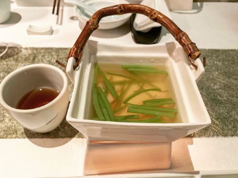 陈QQ.苏Show一直都是我宴请外地好友的首选,美学氛围拉满,春夏秋冬四季时令菜单轮换,尽显姑苏雅韵风味💕整套品鉴下来我实在是很喜欢餐茶,于是想先单独拎出来唠唠。最适宜的餐茶一定是清雅且包容度高的,才不会淹没食材本味。这盏恩施玉露袭蒸青制茶工艺,古法蒸青,生长于海拔1000米,造就“一山有四季十里不同天”,故名意为“恩于日月,施予玉露。”品味着餐茶,清凉雅集开宴,美味开飨😋▪️倷好苏州:以姑苏古城地图化为承载,用江南季节风物制作小食,一杯清茶,一叠美点,风味十足。▪️冷萃荷花茶:姑苏夏季荷花摇曳,取宋代名枞石乳红茶与荷花窨制,乳香中透着荷花的清香🍃▪️消夏知味:四道小菜精美细致考究,分别是手作绿豆包、果醋海蜇花蜜渍热情果、江南脆鳝片。▪️深井浮瓜:结合糟露和时鲜的大连海肠、海胆、马蹄笋和黄瓜肉一起制作糟冻酿在黄瓜里,鲜甜浓郁。▪️鸡枞与蕈:鸡枞手工慢慢拆成细丝,芳香松蕈熬出芳香的菌油,数种菌菇熬制的滚烫高汤现场冲制♨️▪️三虾干丝:虾脑熬汤搭配茭白丝和干丝制作虾汤干丝,虾身肉切粒搭配马蹄和莳萝草制作虾丸脆炸。▪️陈皮牛肉:选用澳洲牛肋骨🥩进行低温慢煮处理,裹上秘制酱汁和十年陈皮粉烤制,焦香可口,肉质脆弹。▪️六月霜色:蟹膏熬制清亮的汤汁,选用饱满多汁的冬瓜肉一同烩制,搭配了六月黄蟹肉,是难得的去暑佳品。▪️小扇引凉:特制面条煮出,风扇自然吹凉,搭配清香的萝卜丝、猪肉丝等和特调的凉面酱汁,口感清爽☁️▪️种豆南山:糯米是顶部绿豆夹,绿豆冰激凌太清爽。▪️老寿眉:沿袭宋代传统击拂收法、建盏,选用12年荒野老白茶煮出的馥郁茶汤,直接用茶汤进行点茶🍵