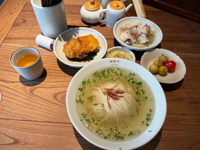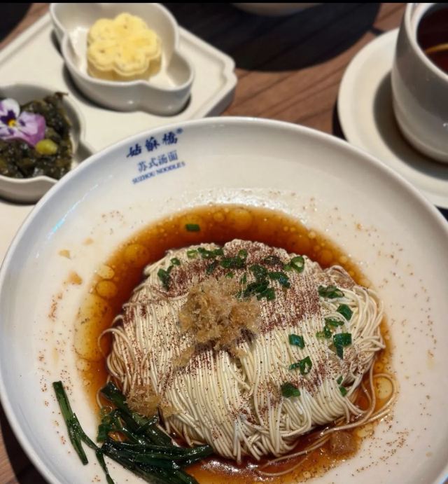 环境: 苏州园林建筑风格,区别于现代化的建筑,有故事有底蕴!一楼有个小庭院,有小鸟,有绿植!真是别有一番风味! 口味: 必吃榜餐厅,口味自然不在话下!匠心猪肝 粉嫩可口,一口下去,直入心间!好吃白汤面 汤汁鲜醇,面条Q弹劲道!古法焖肉 色泽诱人,肥而不腻!考究师傅功底! 服务: 亲切舒服,换碟勤快,菜品知识扎实,介绍朗朗上口! 来苏州,如果你要吃一碗面,一碗带着苏式底蕴的面,你一定要这里!一定会让你非常惊喜!