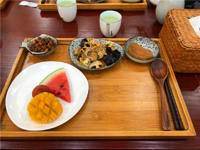 素面,黑椒杏鲍菇,藜麦焗番茄,咖喱角配素鸡块,菌菇汤,凉拌黑木耳,花山乌米饭,炸藕饼,五福袋,素鲍鱼