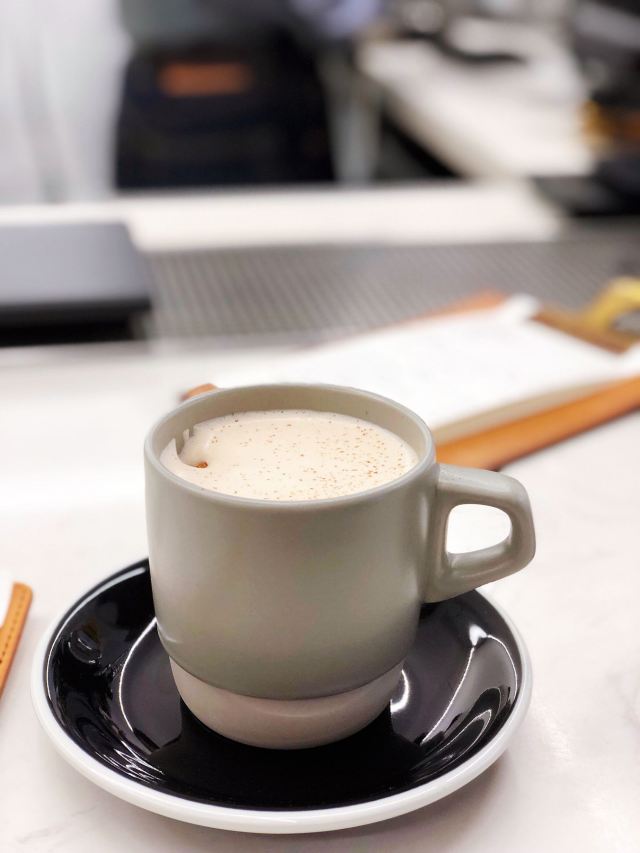 十全街上的小咖啡店,白墙黑瓦的简约外饰、透明玻璃窗,既有苏州味道,又不乏现代感。店内面积不算大,但是给人“麻雀虽小,五脏俱全”的感觉。咖啡出品不错,奶泡细腻,拉花也很漂亮。