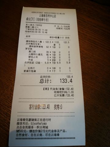 苏州中心吃饭,每家店都要排队,疫情结束大家都出来吃饭,游玩,第二次来云海肴吃饭,印象一如既往的感觉他家价格和份量严重不般配,最为明显的是青稞饼非常迷你的三小块忒迷你了,有点不理解,香茅烤罗非鱼比较好吃,单人原味汽锅鸡建议商家配根吸管,要不那汤想喝到嘴有点困难,建议老板自己喝看看,那天中午坐的是27号桌可能是坐在面对窗户,然头顶灯又是明晃晃的晃眼,很是不舒服,黑三剁碎碎粒粒建议配白馒头、窝窝头好吃。