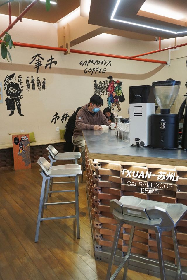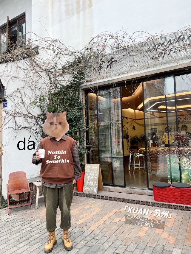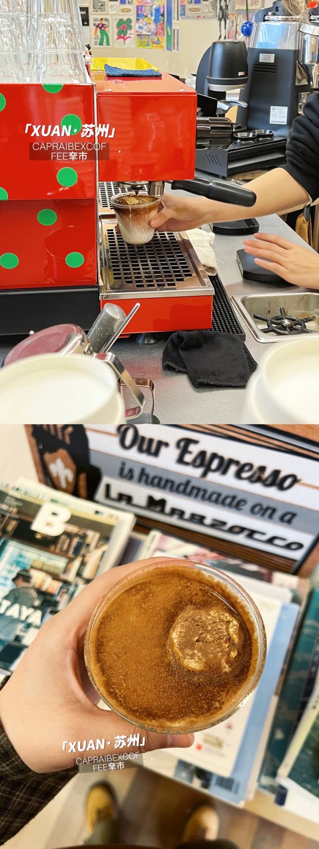 CAPRAIBEXCOFFEE 羍市|苏州 「苏州必去咖啡馆,在平江路附近小巷子里一家好喝且市井味儿足的江南风咖啡馆」 - 搬家后的 「羍市」在一座充满江南风情的建筑一楼。门脸的墙体被藤蔓缠绕着。我去的时候苏州还有些凉,现在的叶子一定更茂盛了。 两台辣妈的咖啡机被喷上饱和度很高的“新衣服”、墙上的小人涂鸦和海报贴纸以及各种小摆件,这些让咖啡馆更生动可爱了起来。 店里单人位置还蛮多的,包括环绕式的吧台也对自己来的顾客很友好。 - 我先点了杯“水牛奶葡萄Dirty”,第一口就被惊艳到了!开心到立马起身去吧台夸赞咖啡师哈哈哈哈哈哈!豆子应该是深烘,牛奶部分是把葡萄干和乌龙茶用水牛奶冷泡,入口丝滑又清爽! 第二杯我选了店里招牌的“甜心污”。咖啡上面是一个朗姆酒冰淇淋口味的冰淇淋球,撒了大量的可可粉。冰淇淋融化后中和了咖啡的焦苦,适合不常喝咖啡的朋友。 可惜晚上我还要赶高铁去上海,怕车上肠胃不适就没有再喝第三杯。 天黑后,老板模样的女生进来和咖啡师聊着天洗着枣,还热情得递给我尝尝。我离开时她们也很热心出来送我,反复和我打了好几次招呼。 苏州之行以「羍市」结尾是段很开心的回忆。 如果日后丝芭还会安排苏州的活动,我一定会再次光顾💙🐳