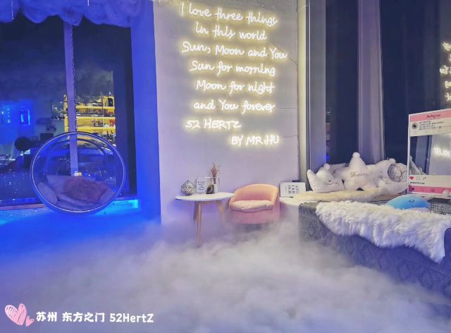 52HertZ咖啡馆位于苏州东方之门52楼,是一家少女心爆棚的空中咖啡馆。整个空间被布置得尤其粉嫩,装修新潮,ins网红风搭配现代工业风格,金边透明吊椅,彩色喷涂的墙面,各种时尚小摆设,到处都是拍照圣地。空间宽敞,从玻璃窗俯瞰,着实令人心醉。 咖啡馆的名字来源于一个叫做Alice的鲸鱼。1989年,Alice被人们发现,正因为它发出的声音频率有52赫兹,而一般鲸鱼只在15-25赫兹之间,无法和其他同类交谈,被称为世界上最孤独的鲸。正如名字52Hertz,店铺的Logo也是一只可爱鲸鱼,而店内角落里也充满了鲸鱼的玩偶,小小的水缸里放着绚烂的水母,充满了梦幻色彩。除了整体环境,甜点和饮品颜值都很高,值得一提的是,咖啡店进门需要用身份证登记才可。 推荐:奥利奥千层、芒果奶酪盒子、月球咖啡、抹茶星冰乐。
