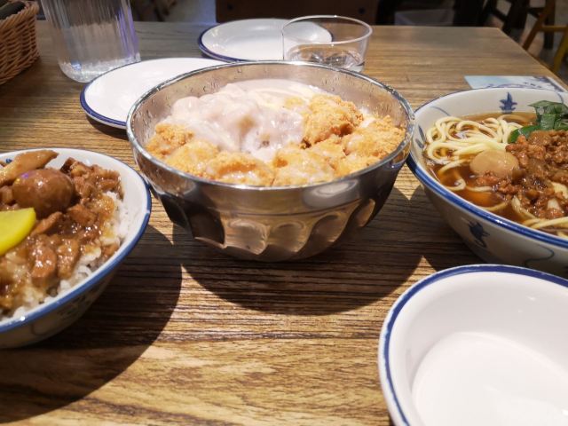 第二次是晚上饭点时间去的,人有点多,再晚一步大概就要等位了。点的卤肉饭 、台式黑椒铁板面都很一般,尤其是铁板面,口味重就算了,还特别油腻。好在金银蛋西兰花还可以,吃点绿色蔬菜就舒服些,鲜美爽口。不过也难说下次再去苏州会不会再去吃饭,毕竟我对台湾菜印象还是挺好的。