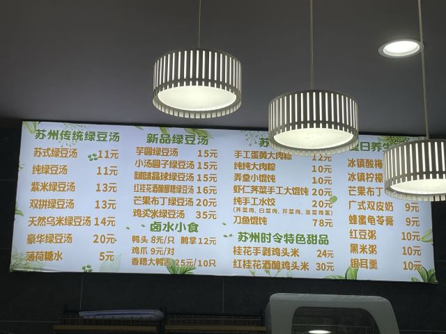 乌米绿豆汤,阿婆绿豆汤,赤豆芋圆,荠菜肉馅馄饨,手工龟苓膏,荠菜手工大馄饨,纯手工水饺,苏式绿豆汤,薄荷糖水,鸡爪,双拼绿豆汤,苏州泡泡小馄饨,芋圆绿豆汤,紫米绿豆汤,自制白糯米薄荷绿豆汤,奶茶