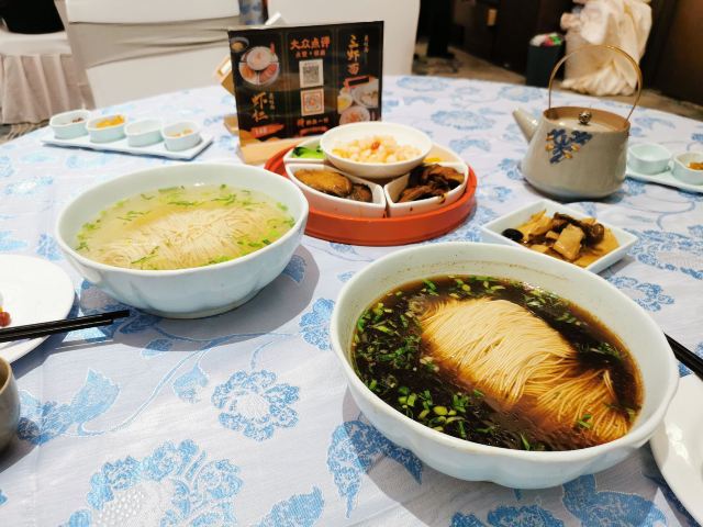 YoYo_5W1H3W2R进大厅左手边楼梯上二楼,楼梯口找小姐姐取号排队[心碎],等了20分钟左右,今天算挺快的了入座后点餐,茶水免费,自斟自饮,小菜四碟|蟹黄花胶面^蟹黄花胶一份,蟹黄还是蛮多的,花胶口感品尝花胶是油发的,很Q弹,好吃,没有一点腥味,赞[亲亲][亲亲][亲亲]一碗拌面,一勺一勺的蟹黄花胶加进来,拌起吃,一个词,舒坦(适意)配菜糟猪肝(我吃口比较淡,感觉有点咸)、白斩鸡(很嫩滑)、酱黄瓜(脆、微酸、解腻)、南瓜冻(软糯)[强][强][强]一碗清汤+一份甜品(酸奶,口感偏酸的,比适合我的口感)[坏笑][坏笑][坏笑][薄荷]环境:老牌子的店,装修还行,毕竟星级在这儿,干净卫生[服务铃]服务:取号、引导入座、点餐,中规中矩总的来说,还是不错的价格由于我是剪羊毛的套餐券,性价比很高如果是正常来吃还是推荐常规的奥灶面,当然,虾仁套餐、蟹黄花胶套餐偶尔来品尝一下也是非常OK的[愉快]