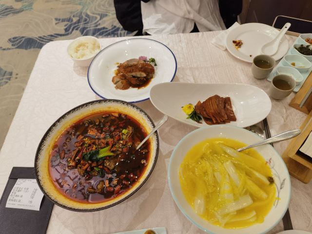 YoYo_5O4J4P0A口味不错,就是太咸,我往红汤里加了一壶白开水,还是齁咸,口干了两天。环境设施较老,但总体比较整洁。晚餐的鱼不错。